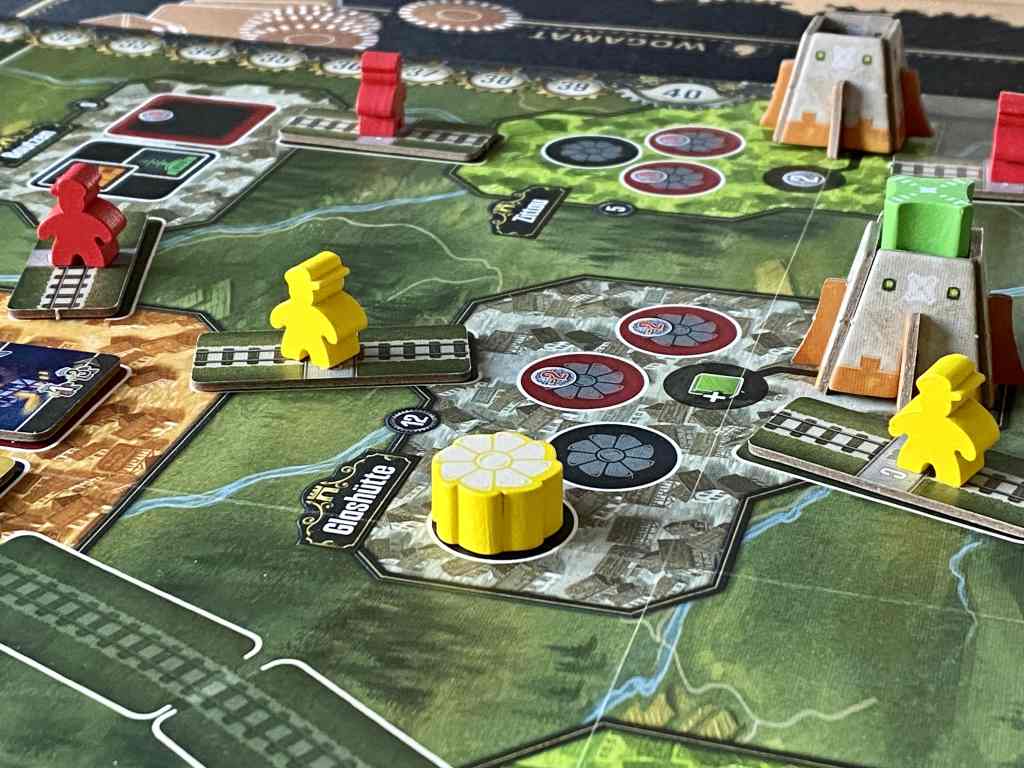 Pour briller, rien de mieux qu’une thématique de production d’électricité en Allemagne de l’Est au XIXe siècle. Quoi ? Cela ne vous réveille pas quelques papillons dans le ventre ? Et bien, moi, si, et j’assume. Certes, le thème peut paraître austère, mais j’en ai quelque peu ma claque de l’écologie, des papillons et des fleurs autour. Ah et puis, les joueurs vont devoir poser des voies ferrées pour créer des réseaux afin d’acheminer charbon et uranium vers des centrales électriques afin d’alimenter des bâtiments en énergie. Et j’aime les jeux de trains, enfin plus exactement les jeux de trains sans train. La thématique n’est peut-être pas sexy, ni originale, mais me donne, très subjectivement, une envie folle de jouer. En plus, une fois n’est pas coutume, elle est très bien respectée et concrétisée. Les protagonistes se surprennent à ressentir une immersion plutôt convaincante. Et quand la mécanique est aussi percutante, on peut parler d’exploit.