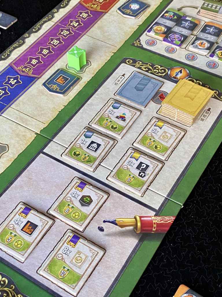 – Jouer une tuile Action de sa réserve sur l’emplacement libre le plus à gauche en haut de son plateau personnel. Le joueur actif résout ensuite les actions indiquées sur cette tuile dans l’ordre de son choix. Enfin, avant ou après avoir réaliser ses actions, il peut remplir un Contrat en réunissant les conditions requises afin d’obtenir des bénéfices. Ces Contrats sont de deux ordres : violet sur le plateau de jeu, ou argent/or, préalablement réservés et désormais dans sa zone de jeu.