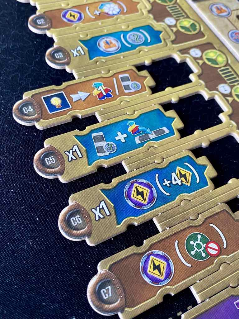 Alors, si la perfection n’existe pas, c’est peut-être avec son décompte final que NUCLEUM va choir. Et bien même pas, la fin de partie est également bien plus fluide et sereine que d’autres « eurogames » de sa trempe. Il faut dire que les phases de recharges ont préparé le terrain. En effet, c’est en passant son tour en quelque sorte, qu’on se refait une santé niveau ressources et tuiles, et qu’on place nos pions en vue du décompte final en faisant le bilan de nos productions énergétiques. Tout ça est véritablement étincelant. De plus, les joueurs peuvent anticiper une fin de partie, pour le coup, non-abrupte, avec ce système d’un nombre de conditions à atteindre, souple, mais plus tactique qu’il ne paraît.