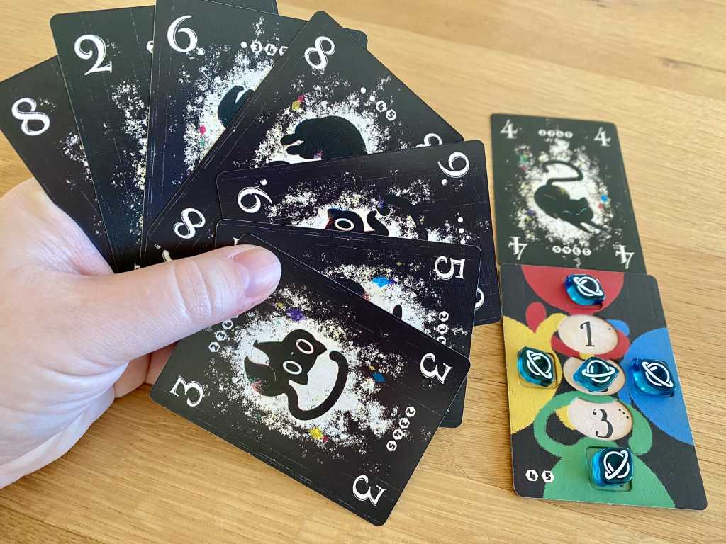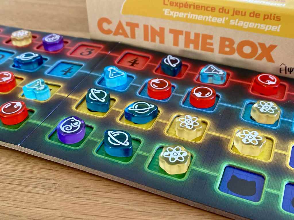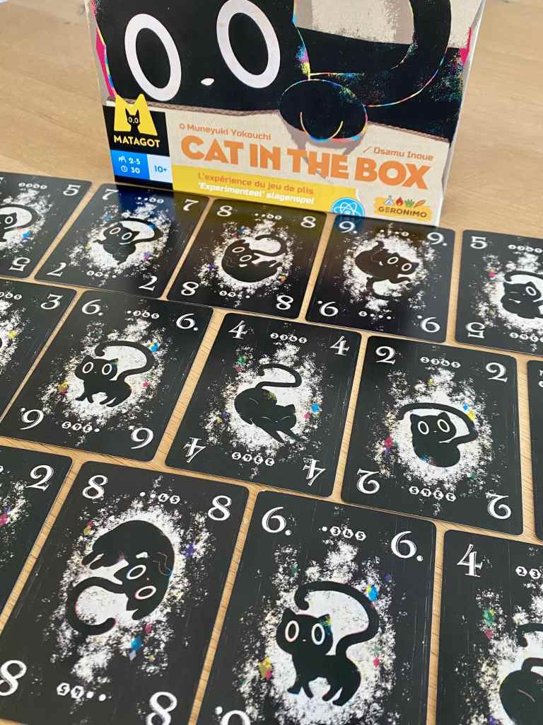 Mais tout n’est pas si simple. Les joueurs devront éviter de créer un Paradoxe, c’est-à-dire de ne plus pouvoir jouer une seule carte de leur main. À défaut, le joueur concerné met fin immédiatement à la manche et perd les points de ses plis réalisés. À l’inverse, les autres participants gagneront un point par pli réalisé, ainsi qu’un bonus de placement s’ils sont parvenus à atteindre l’objectif projeté en début de manche. En plus d’être un jeu de plis, CAT IN THE BOX propose des paris et des enjeux de placements sur le plateau commun. Les joueurs tenteront donc de jouer des cartes proches les unes des autres, tout en faisant le nombre de plis annoncé, en prêtant attention de pouvoir jouer jusqu’au bout.