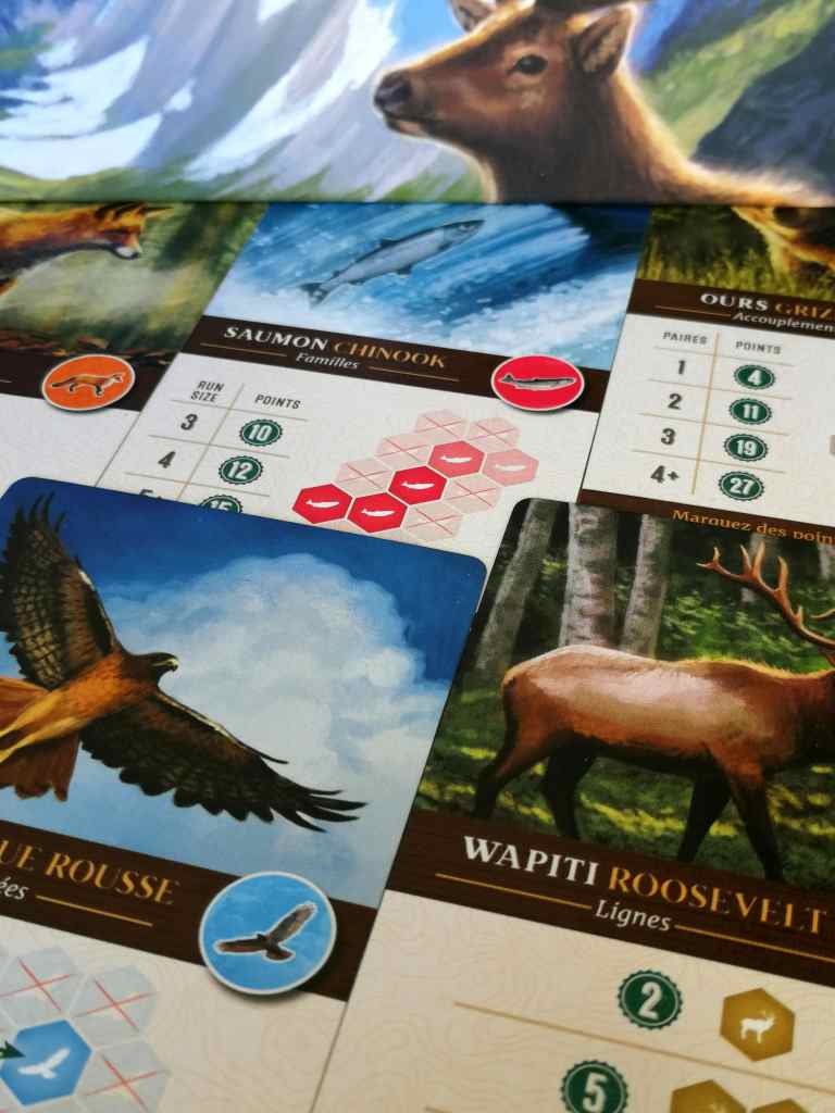 Car CASCADIA est un jeu clairement d’optimisation où chaque choix doit être effectué pour sa rentabilité. Le placement des tuiles par type d’habitat est essentiel et fait d’ailleurs souvent la différence en fin de partie. Mais il doit également être pensé pour accueillir des animaux susceptibles de répondre aux objectifs communs de fin de partie. La liberté ressentie au tout début s’effrite peu à peu pour répondre aux exigences de ce puzzle intelligent.