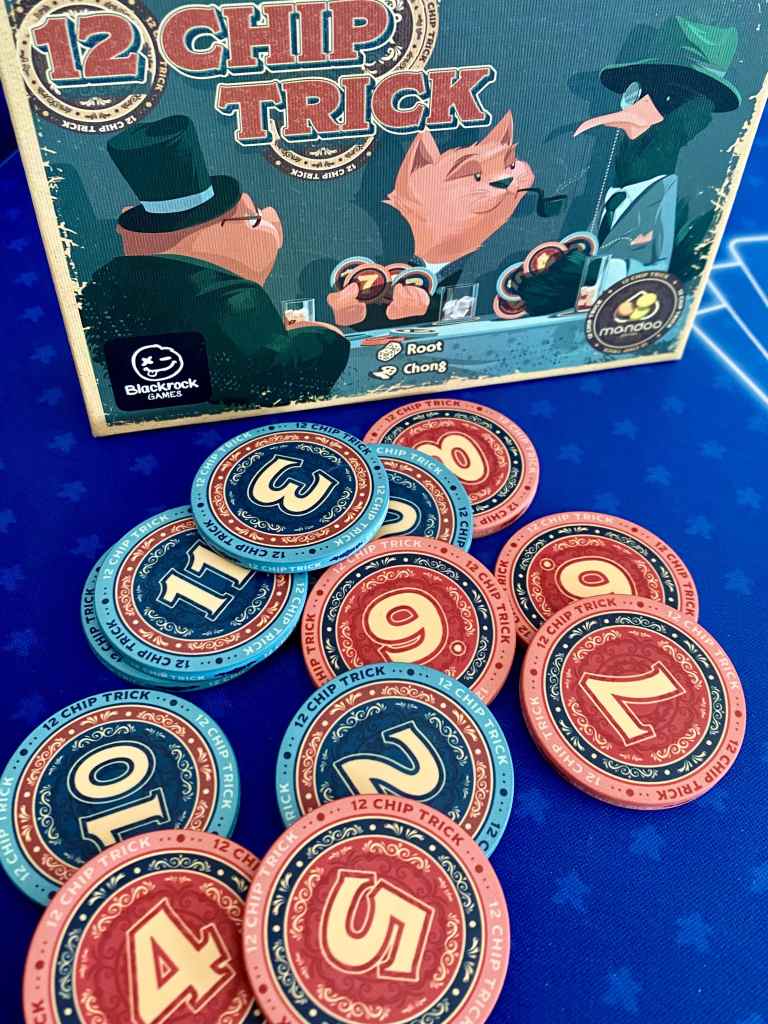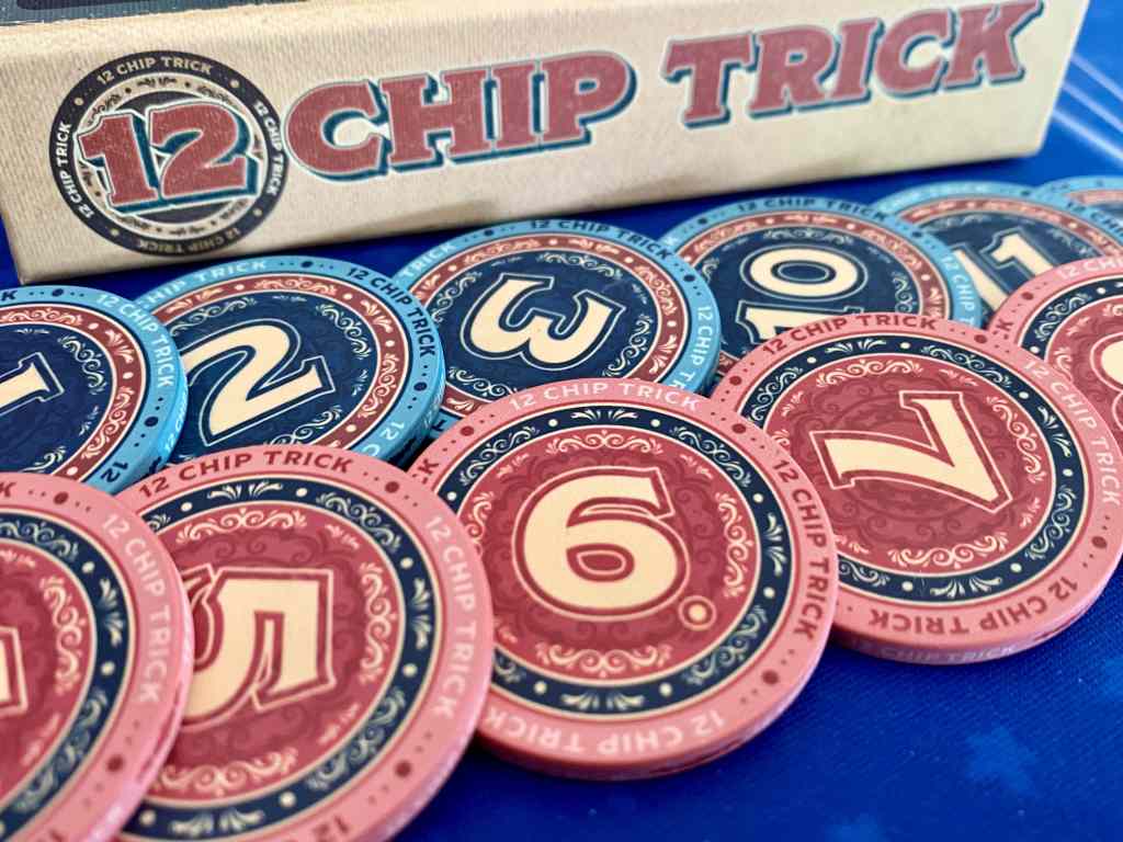 Alors que se cache-t-il donc derrière un nom pareil ? 12 CHIP TRICK est en réalité un jeu de plis, avec des jetons ! Le joueur ayant joué la valeur la plus élevée remporte le pli et choisit un jeton joué pour le placer, face visible, dans sa zone de jeu, avec une priorité sur les rouges, c’est-à-dire les jetons de moyens calibres. En sens horaire, les autres joueurs récupèrent un jeton, qu’ils ajoutent à leur main, pour le jouer ultérieurement. Ainsi, la mémoire côtoie quelques déductions de couleurs pour des parties endiablées, remplies de choix tactiques dans une belle ambiance.