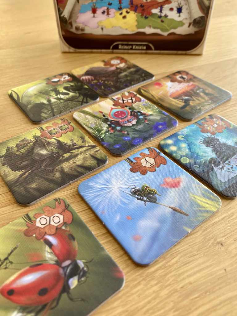 Les joueurs vont donc incarner des colonies de fourmis souhaitant se répandre sur un territoire commun. Très sincèrement, ils vont devoir bien les imaginer ces fourmis, car le thème, même s’il est plaisant, s’efface complètement au profit de chiffres et d’additions. La mécanique de « I split, you choose », elle aussi, est bien trop forte et puissante pour laisser une quelconque place au thème. Elle consiste à scinder en deux groupes des éléments afin que l’adversaire en sélectionne un et réalise les effets ainsi gagnés. Le joueur actif se retrouve donc à réaliser les actions du groupe restant. Ce système de jeu, particulièrement savoureux et subtil, oblige ainsi à lire dans les pensées adverses pour déceler les envies et tenter de faire pencher la balance d’un côté plutôt qu’un autre, et de récupérer en conséquence les options qui nous intéressent réellement. La répartition entre les deux groupes est un numéro d’équilibriste très tendu, alors même que l’idée est toute simple. Il s’agit de donner un peu pour tenter de prendre beaucoup, sans être vu !