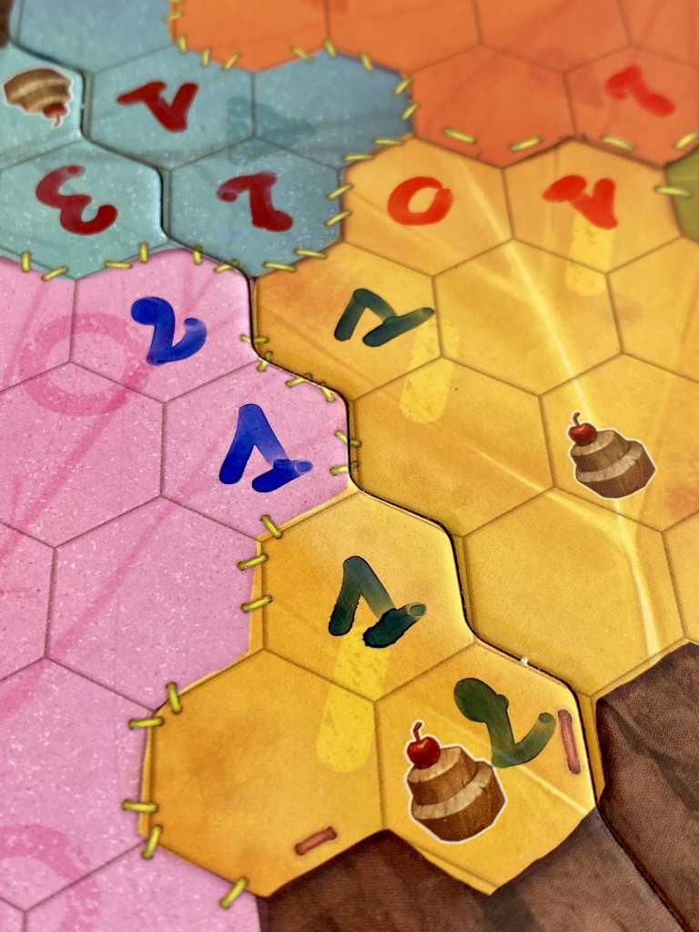° Un chiffre doit être inscrit sur un hexagone libre du plateau principal dans la zone correspondant à la couleur de dé obtenu et adjacent à un chiffre personnel déjà écrit. L’utilisation de Fourmilières permet d’ignorer cette règle d’adjacence. Un joueur peut également récupérer une Caisse ou un Cupcake à l’inscription d’un chiffre dans une case qui contient l’icône correspondante.