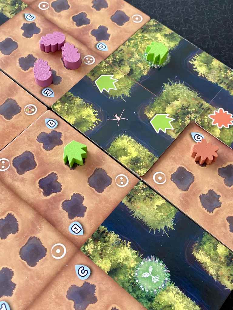 ° Placer des cartes Marécage dans leur tourbière sur des sections accueillant les mêmes plantes que celles affichées sur les cartes choisies. Les pions Plante sont dans un premier temps retirées temporairement pour positionner la carte. Certaines plantes sont enracinées et se positionnent sur la carte quand d’autres sont défaussées. Enfin, les plantes restantes rejoignent le cours d’eau de la carte nouvellement placée afin de dériver vers une section vierge de la tourbière ou sur des emplacements de racines, en suivant les cours d’eau. Si un joueur est le premier à recouvrir une section, il récupère un jeton eau. L’eau permet, à tout moment, de déplacer un pion Plante dans sa tourbière.