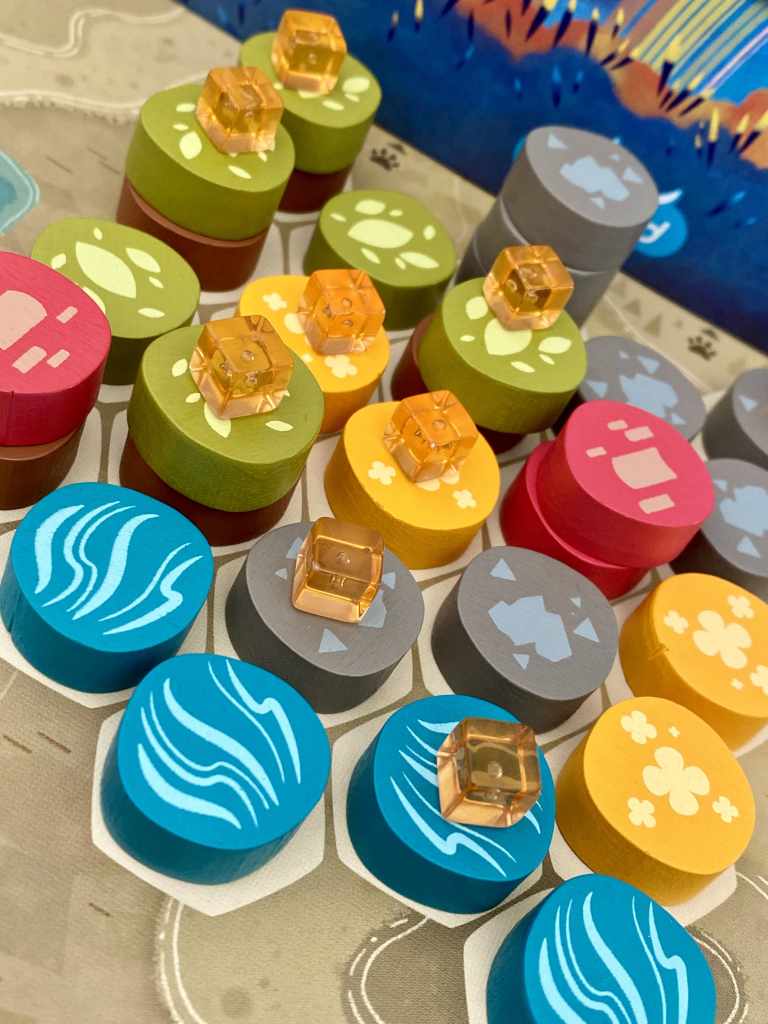 Cela n’aura échappé à personne, HARMONIES est tout simplement sublime. L’effet « whaouuuu » esthétique ne s’estompe même pas après plusieurs parties. Les cartes conjuguent à la perfection beauté, subtilité et lisibilité des informations. Les couleurs sont chaleureuses, et les animaux qu’elles présentent ont l’air plus vrai que nature. Un immense bravo et un gigantesque merci à Maëva Da Silva pour ce boulot d’orfèvre. Le reste du matériel n’est pas en reste. Les jetons sont extrêmement agréables à manipuler, et assignent une ambiance très tranquille autour de la table comme si le jeu allait être une promenade de santé.