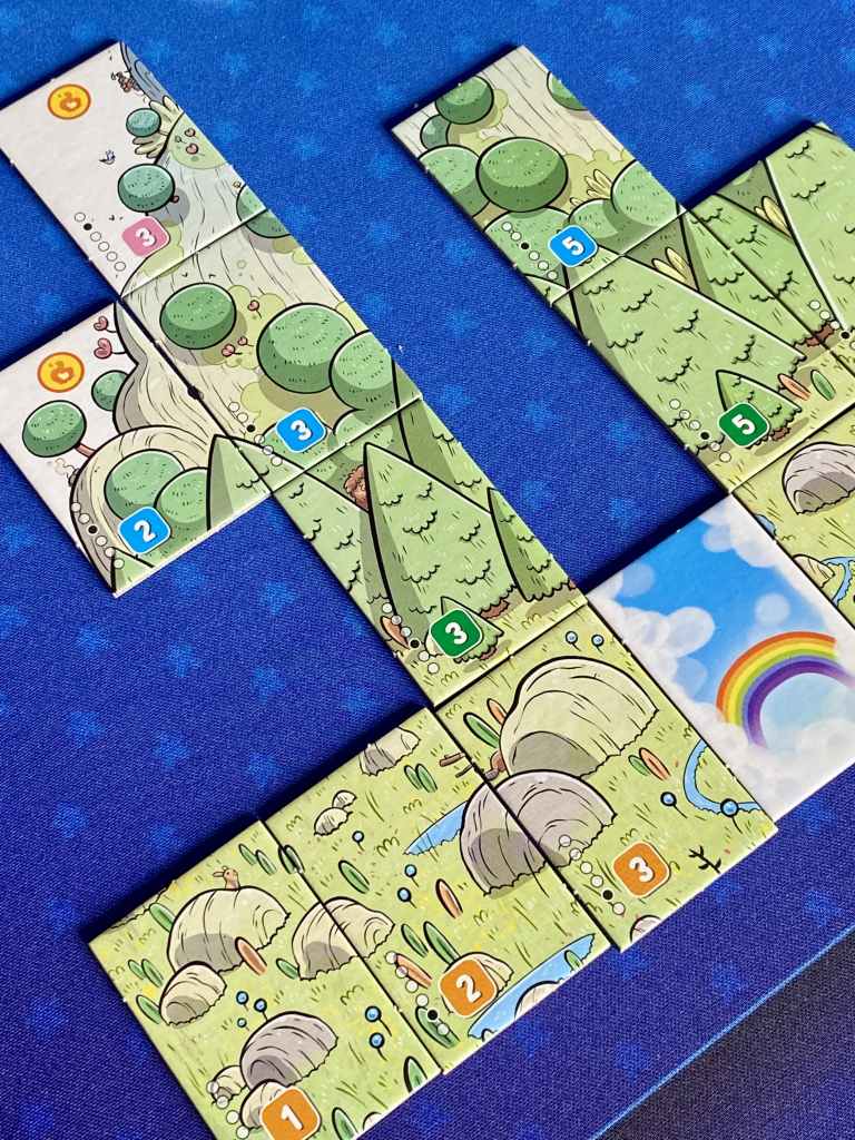 – Reconstituer son panorama avec les tuiles ainsi récupérées selon le modèle donné par l’aide de jeu. Les Arcs-en-ciel peuvent être ajoutés à la place de n’importe quelle tuile. De plus, lorsque quatre tuiles contiguës forment un carré dans le panorama, le joueur peut révéler deux esprits de la pioche pour en choisir un ou sélectionner un esprit déjà révélé. Ces esprits offrent des capacités immédiates ou de fin de partie.
