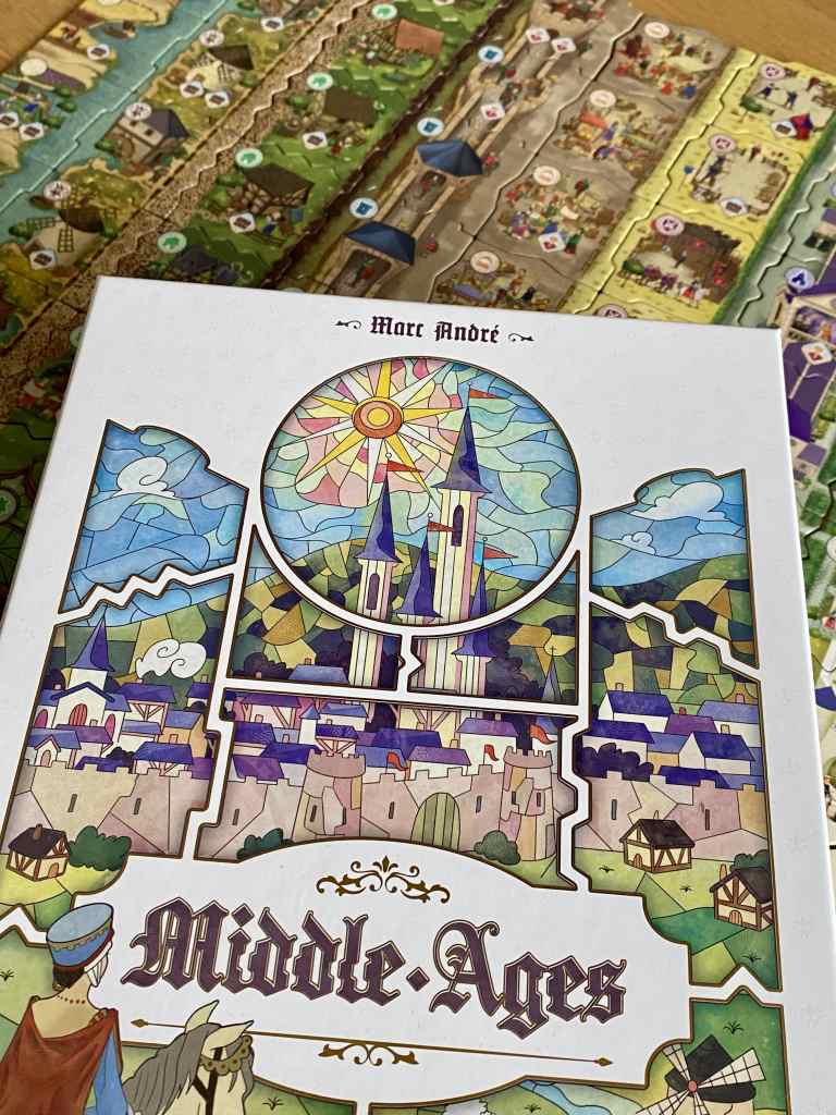 MIDDLE AGES est une refonte de MAJESTY, édité par Hans im Glück en 2017. N’ayant jamais joué à celui-ci, c’est avec beaucoup de curiosité que je découvre le titre de Marc André, le non moins célèbre auteur de SPLENDOR.