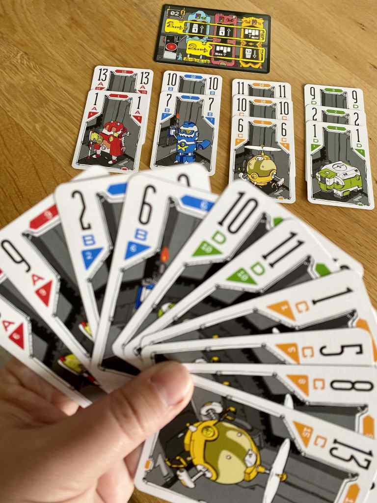 Donc, oui, il y a un quatrième joueur dans ROBOTRICK, dont la main de cartes est connue de tous et les réactions prévisibles. L’idée est absolument géniale. Et si les joueurs ont la prétention, au départ, de la trouver facile à maîtriser, le jeu va en réalité leur donner du fil à retordre. En effet, sur le papier, c’est plutôt simple. Il s’agit d’un jeu de plis traditionnel, dont la couleur de l’atout change d’une manche à une autre. Facile ! D’autant plus quand on connaît les potentialités d’un joueur sur quatre. Oui, mais non ! En fait, cette visibilité va grandement interroger nos façons de jouer, et va perturber grandement nos habitudes. Ce qui était attendu comme une aide devient une complexité insoupçonnée.
