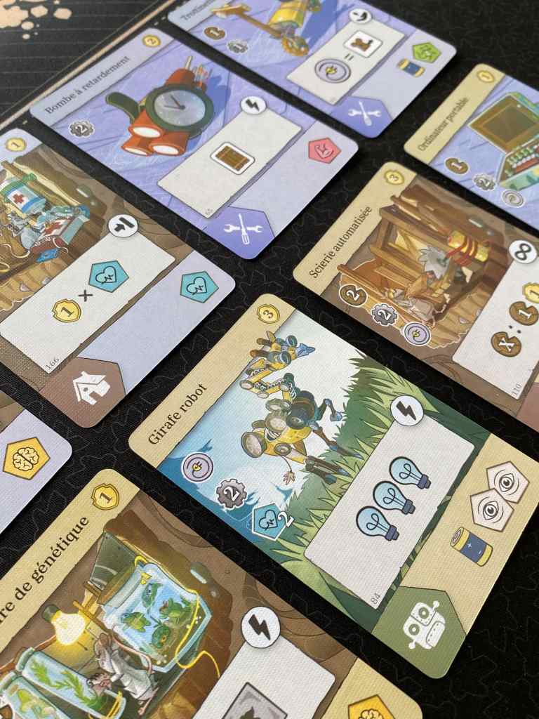 D’ailleurs, la roue n’est pas seule à permettre une progression véritablement jouissive en cours de partie. La collection de symboles, servant de prérequis à la pose de cartes, donnant à leur tour de nouveaux symboles et capacités provoque des enchaînements à faire pâlir ARK NOVA. Pardon, je m’emballe… Mais il est impossible de ne pas penser à ce mastodonte de Super Meeple quant à l’utilisation des cartes Invention par ici. Aussi, la réalisation des missions débloque de nouveaux attributs personnels, tout comme la construction de lits. En réalité, il s’avère bien difficile de mettre un terme à la partie tant les possibilités augmentent au fur et à mesure. Les joueurs auraient bien fait une dernière manche, puis une suivante, et une de plus pour terminer ce qu’ils ont commencé.