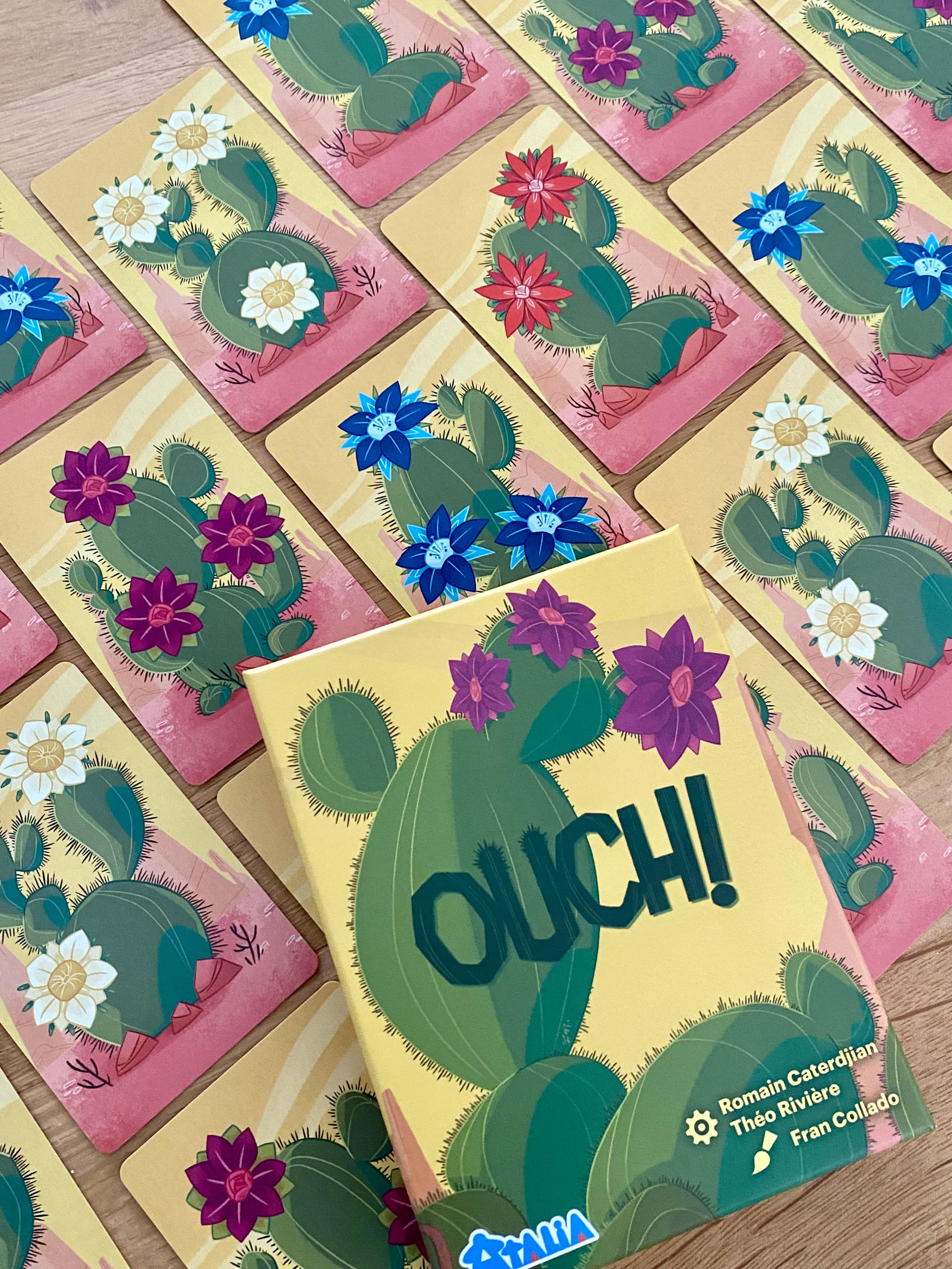 OUCH ! est un jeu de Romain Caterdjian et Théo Rivière, que l’on a curieusement peu entendu parler. L’illustration de couverture est pourtant très attrayante, tout comme le titre s’avère drôle et le format pratique.