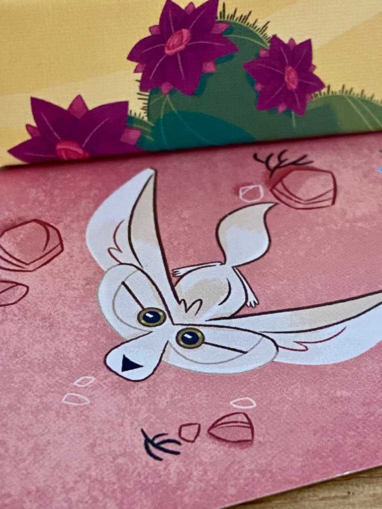 Cette petite boîte renferme en effet un jeu de hasard et de collection bien conçu et plutôt malin. À son tour, le joueur actif doit retourner une carte Cactus par l’un de ses côtés sans se faire piquer. En effet, la face visible d’une carte contient autant de fleurs que de côtés urticants, face cachée. Aussi, comme les collections de fleurs rouges ou les sets de quatre couleurs rapportent un bonus de points, les participants prendront plus ou moins de risques à retourner une carte plutôt qu’une autre. Les serpents et les fennecs viennent ajouter encore un peu plus de piquant avec leurs capacités spéciales. OUCH ! devient, de ce fait, un jeu de prises de risque, extrêmement bien pensé.
