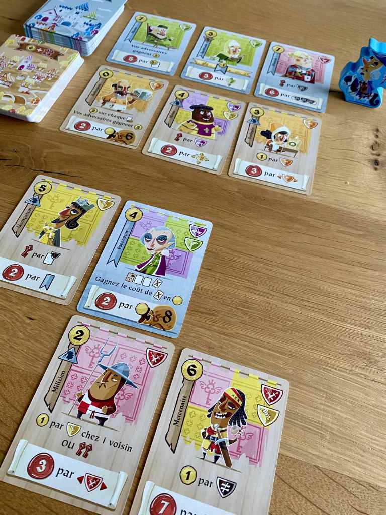 CHÂTEAU COMBO se situe, sans doute, un cran en dessous du côté de l’innovation. Il apparaît même très classique. Les joueurs vont acheter des cartes, provenant de deux rivières différentes pour former un tableau de trois par trois. Les cartes possèdent un effet immédiat ou une capacité permanente et une façon de « scorer » en fin de partie. À la manière d’un HAPPY CITY, les deux pioches de cartes possèdent plus ou moins chaque type. Les participants vont donc jongler entre les deux rangées de cartes pour obtenir celles qui « combotent » le mieux ensemble. C’est simple, basique et sans grande surprise, mais c’est irrésistible d’efficacité.