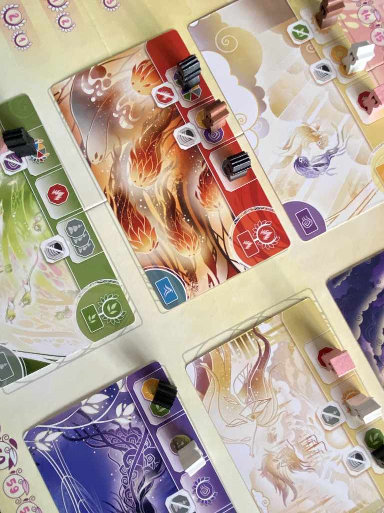 En effet, INORI est un jeu de collection de jetons. Certes, on a connu plus « glamour », mais finalement, ça le fait grave comme disent les jeunes. Les participants sont surpris d’aimer cette idée basique d’accumulation d’offrandes pour décompter leurs points aux moments les plus opportuns. Oui, dans INORI, on peut choisir l’instant où l’on souhaite « scorer » dans une couleur spécifique. Et ça, c’est chouette. Le titre réclame un fort opportunisme et s’appuie sur des interactions, au moins aussi fortes.