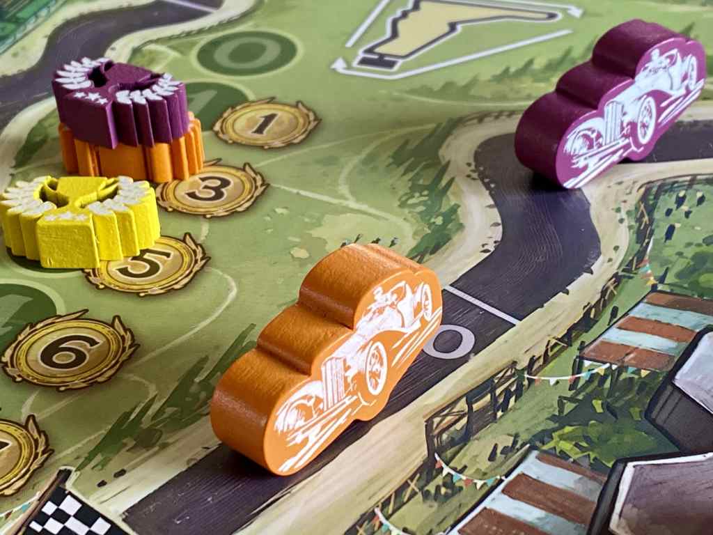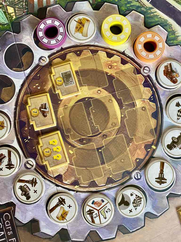 + Grand Prix : déplacer sa voiture de course sur le circuit d’un nombre de cases égal à la valeur du moteur et d’un éventuel bonus permis par le placement d’ouvriers sur les cases dédiées du garage. Lorsque la voiture franchit la ligne d’arrivée, le pion personnel Grand Prix est déplacé d’un cran vers le bas.