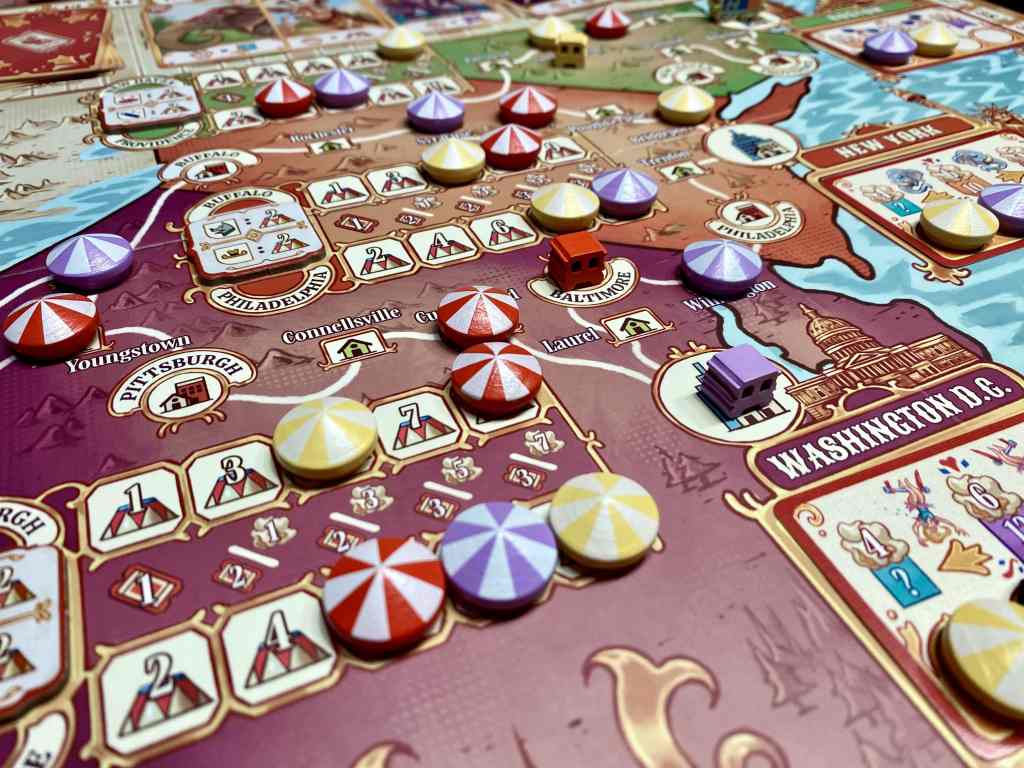 + Déplacement de son Cirque. Le joueur actif déplace sa caravane d’une distance maximale égale au nombre de trains visibles sur son plateau personnel.