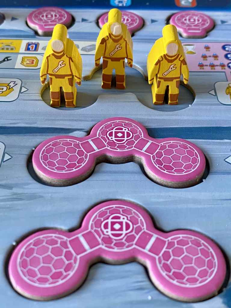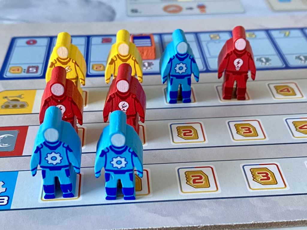 – Phase d’Action. Suivant le nouvel ordre du tour, les joueurs réalisent l’une des trois actions principales possibles en déployant un de leurs astronautes :
