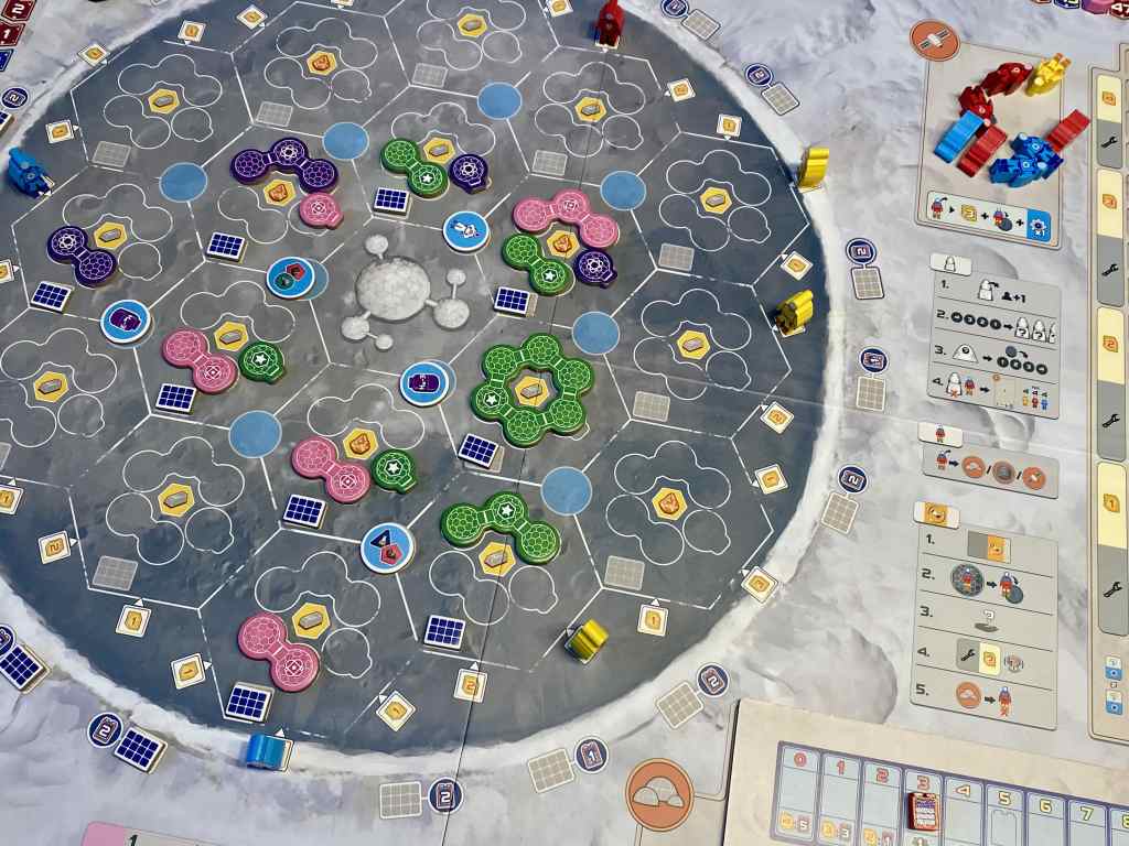 – Phase de Maintenance. Les joueurs mettent à jour les plateaux Corporation, vident le centre de Commandement, récupèrent leurs revenus débloqués et les astronautes autour du cratère. C’est le joueur possédant la plus grande structure dans chaque alignement qui s’empare de l’astronaute correspondant. Il le positionne dans sa base, dans une structure construite. Enfin, les concurrents paient les coûts de maintenance de leur base, selon les structures construites.