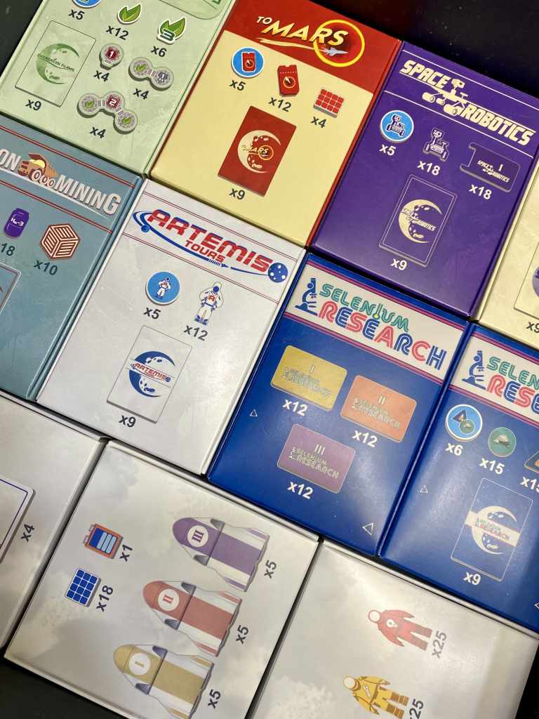 – Phase de Navette. Des tuiles Navette sont révélées selon le nombre de participants. Dans l’ordre inverse du tour, les joueurs en sélectionnent une et récupèrent les astronautes et ressources associés. L’ordre du tour est mis à jour suivant selon l’ordre croissant des tuiles choisies. Enfin, les astronautes de la navette restante sont placés dans le Portail Lunaire.