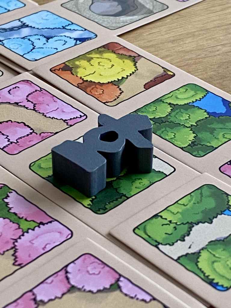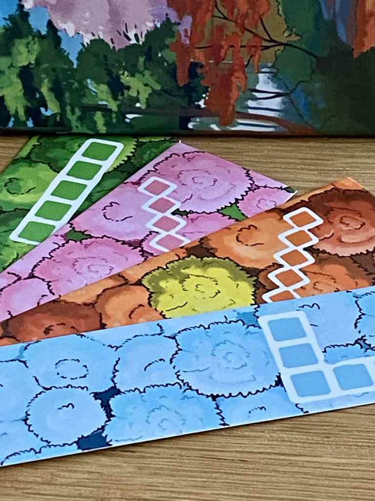 – Compléter sa main. Le joueur actif complète sa main pour posséder trois cartes Jardin. Il prend les cartes dans la rivière ou dans la défausse à condition d’avoir recouvert au moins une parcelle par une parcelle de même couleur.