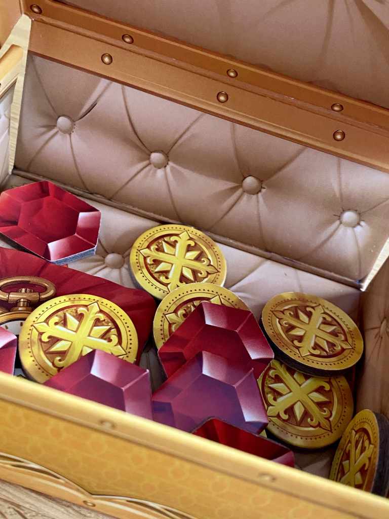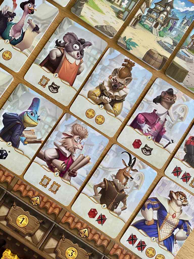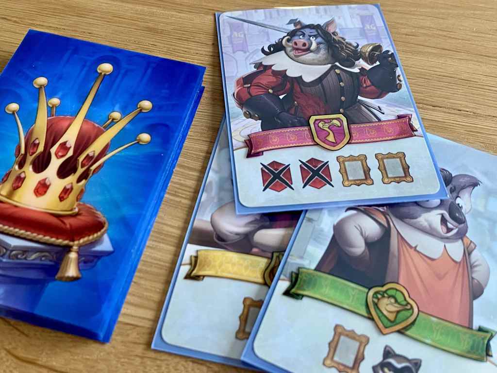 Effectivement, il est bien question d’animaux transformés en humains dans le but de conquérir la tête d’un nouveau Royaume. Le « pitch » n’est pas des plus originaux, mais a le mérite de mettre en scène un monde coloré et particulièrement agréable à l’œil. Le matériel est impeccable et comble toutes les attentes du public familial cible. Les coffres permettant de cacher sa fortune en sont le parfait exemple. Vraiment, sur cet aspect, le titre marque des points. On peut chipoter sur l’illustration de couverture assez peu attrayante et manquant de modernité, mais dès l’ouverture de la boîte, les doutes se dissipent instantanément.