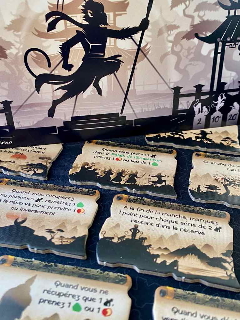 – Placer un singe sur une case libre d’un lieu et résoudre l’effet correspondant. Il s’agit de récupérer des cartes Armes du Dragon, des Jades, des Singes, des Pêches ou de déplacer le Roi Singe.