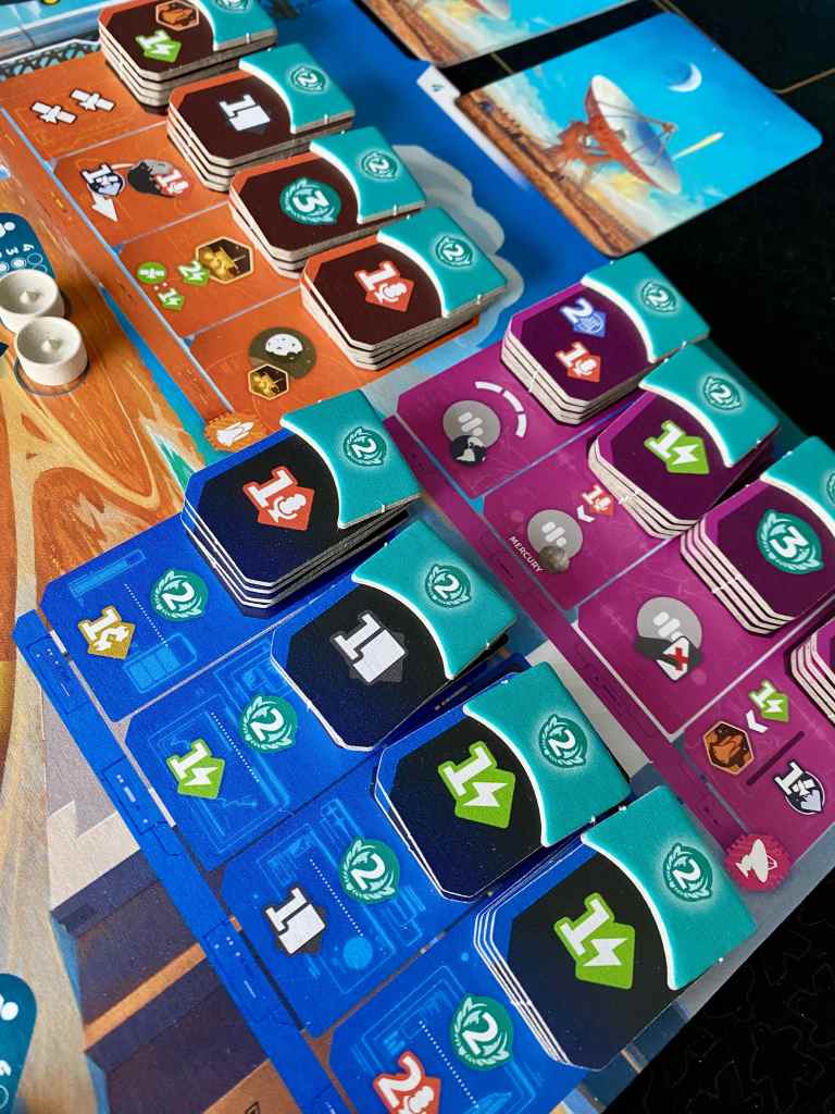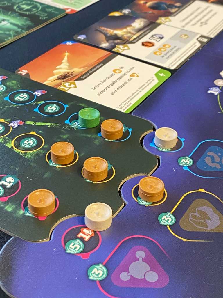 Certes, ils n’ont pas le temps d’en profiter beaucoup, car il faut immédiatement se remettre la tête dans le guidon. Enfin, immédiatement, c’est vite dit. Le plus gros souci de SETI, c’est son manque de rythme. L’attente entre deux tours peut être longue, d’autant plus qu’il est presque impossible de prévoir à l’avance des projets avec assurance. Le jeu est bien plus tactique que stratégique. Beaucoup d’éléments peuvent changer entre deux tours et le nombre de choses qu’il est possible de faire fait tourner la tête. Les plans changent souvent et le temps de jeu augmente. Oui, les parties sont longues, que ce soit à deux ou à quatre joueurs. Sur ce point, je suis étonnée que la mise en place soit la même selon le nombre de concurrents. Les prises de majorités, même si elles fonctionnent bien à deux, mettent un certain temps à se décanter.