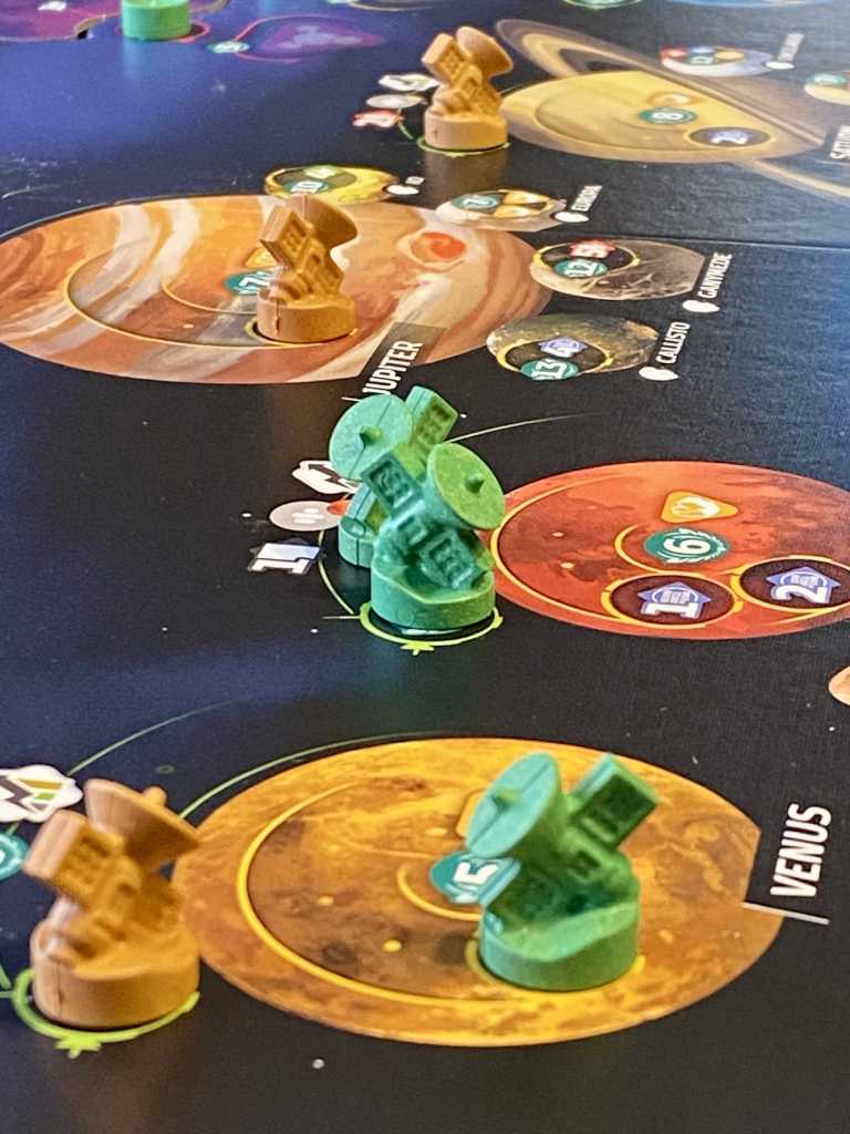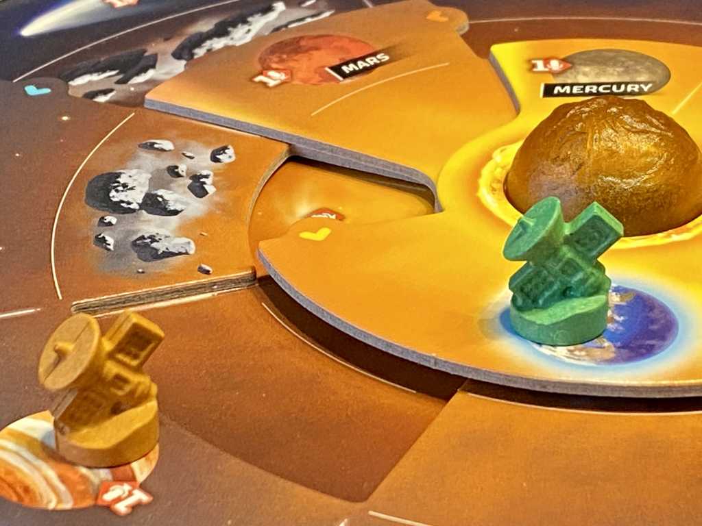 Mettre une sonde sur orbite (coût : 1 Crédit + 1 Énergie). Il s’agit de retirer sa sonde du plateau Système Solaire pour la positionner à côté de la planète sur laquelle elle se trouvait. Ce positionnement octroie des bonus, plus des points de victoire pour le premier joueur à s’installer.
