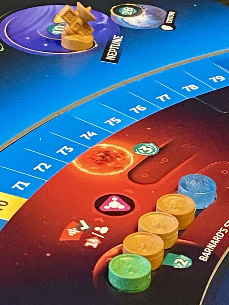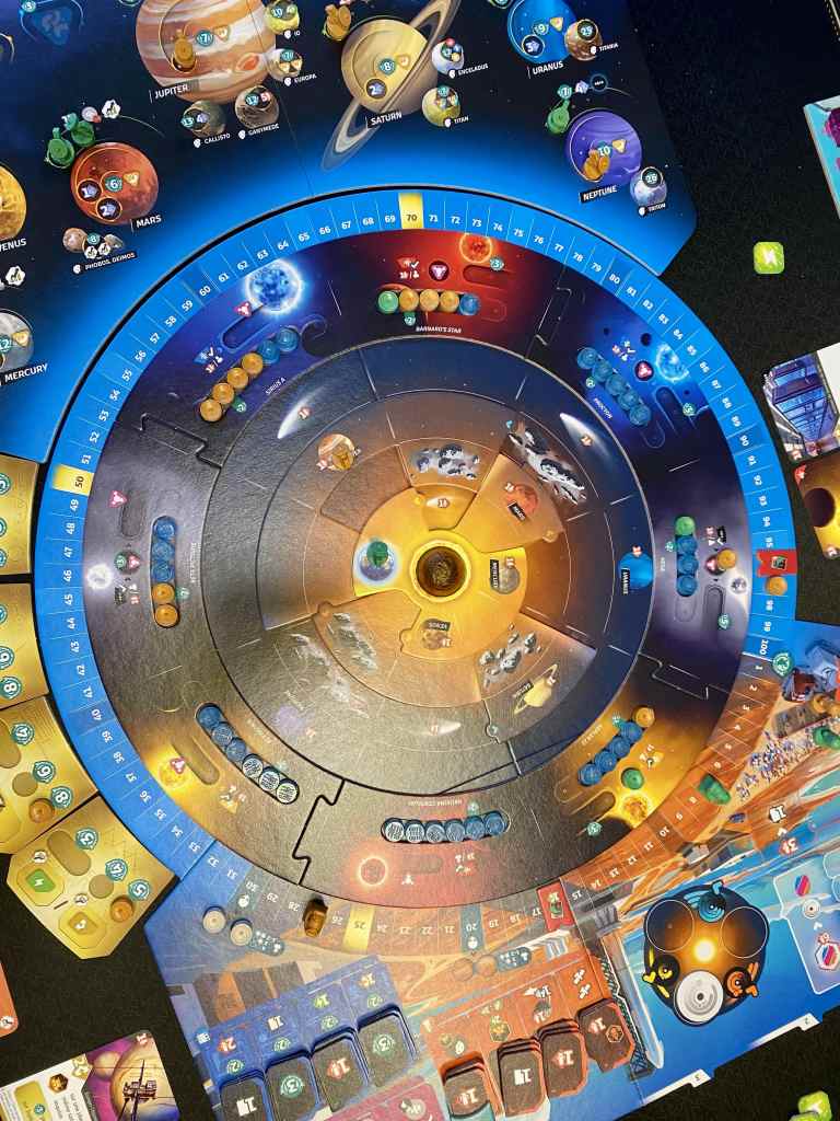 Mais cette motivation est vite récompensée, car le titre se révèle vraiment chouette et étrangement fluide, par rapport au nombre de paramètres qu’il met en scène et que je viens d’énumérer. Je veux revenir sur trois éléments qui me plaisent particulièrement. Le premier, c’est évidemment les deux plateaux Extraterrestre, que les joueurs découvrent au fil de la partie, avec leurs règles et leurs récompenses spécifiques. Ces deux surprises apportent un peu de « fun » à ce très gros jeu velu et calculatoire. L’envie de découvrir toutes les espèces est bien là ! Le second, c’est ce plateau rotatif. Les trois parties qui le composent tournent à tour de rôle, de façon à pouvoir anticiper quelque peu les déplacements des sondes envoyées dans le Système Solaire. Mais très honnêtement, les projections sont difficiles à réaliser et ce tourniquet a de quoi vous faire devenir fou lorsque tous vos plans partent en fumée par le simple déplacement d’un petit disque. C’est bon, c’est fort, c’est puissant, c’est brillant. Le troisième, c’est cette difficulté à gagner des ressources. Qu’est-ce qu’on transpire pour essayer de s’en sortir ! En ce sens, les participants tentent en permanence de créer des chaînages d’action pour essayer d’obtenir un « pauvre » crédit afin de mener à bien l’action envisagée. Cette frustration, elle est aussi pénible que satisfaisante. Les joueurs sont en recherche permanente de solutions, et lorsqu’ils les trouvent, la fierté jaillit sur les visages.