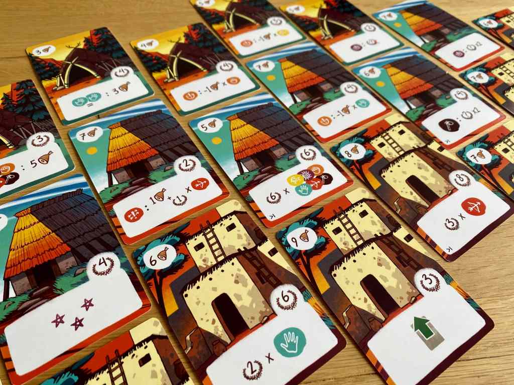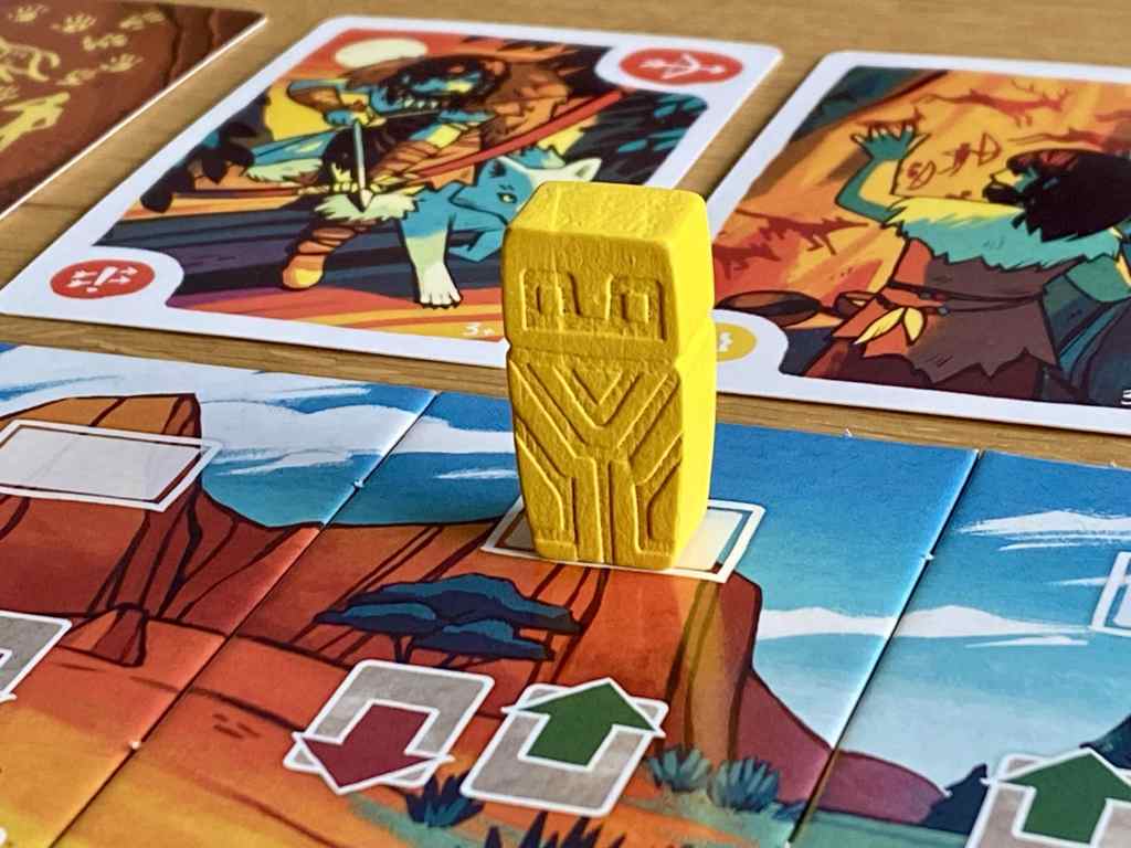 – Résoudre les actions. À tour de rôle, en commençant par le joueur possédant le Totem le plus à gauche, puis en continuant vers la droite, les participants résolvent l’action indiquée sur la tuile qu’ils occupent. Il s’agit de récupérer une ou plusieurs cartes (gratuitement pour les Personnages, en payant un coût en nourriture pour les Bâtiments) de la rangée supérieure et/ou inférieure. Après avoir réalisé leurs actions, les joueurs replacent leur jeton Totem sur la piste d’ordre du tour, de haut en bas. Un bonus ou un malus est octroyé selon la position dorénavant occupée.
