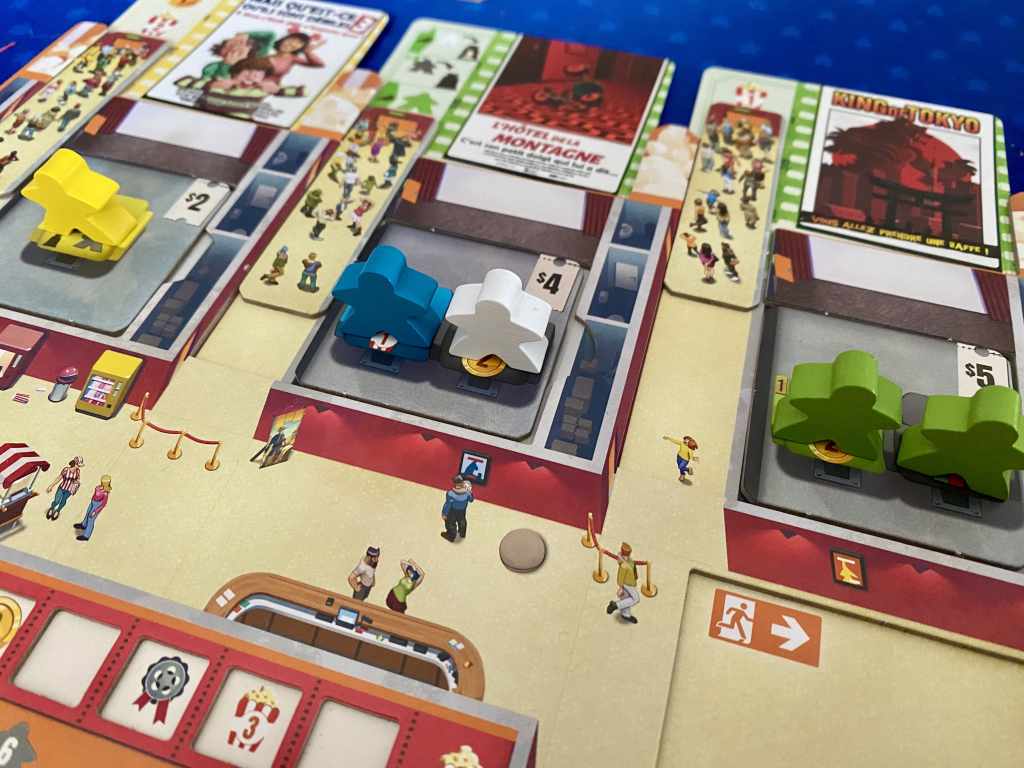 ° Acheter un Film. Il s’agit de choisir une carte Film parmi celles disponibles au centre de la table, de payer son coût et de le mettre à l’affiche, c’est-à-dire de l’insérer dans l’une des trois fentes de son plateau personnel. La glissière File d’attente est repositionnée en bas de la carte. Les films achetés en avant-première (sur la première ligne) possèdent un coût supplémentaire, mais permettent de gagner un Spectateur de la couleur du Film récupéré. Aussi, si la tuile Salle présente en face du film mis à l’affiche comprend le nombre exact de sièges qu’il réclame, le joueur actif déclenche un bonus.