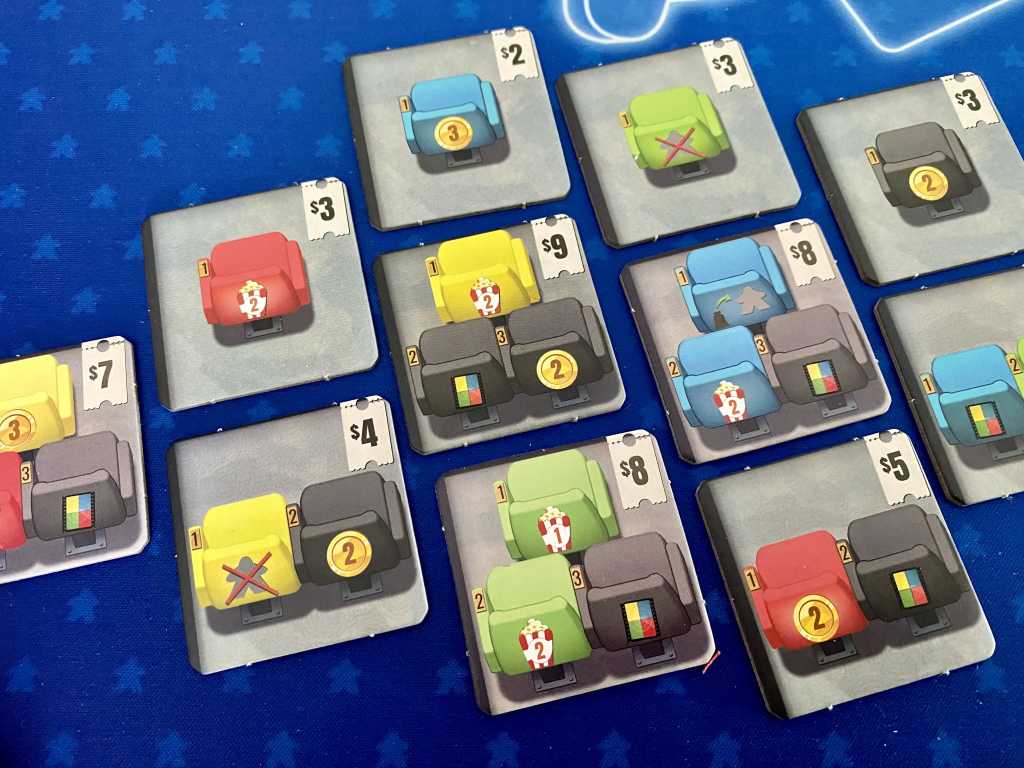 Il y a bien un petit bémol tout de même ! La boîte et le matériel laissent à penser que POPCORN s’adresse à un public familial. Certes, les règles ne sont pas compliquées, mais le jeu fait bien plus de nœuds au cerveau que prévu. POPCORN est un « Bagbuilding », dans lequel les joueurs doivent faire venir les clients appropriés devant les films projetés, et ce, dans des salles spécialisées. Si ces trois éléments s’accordent, alors c’est le « jackpot » et l’assurance de recevoir de nombreux bonus. En ce sens, il me fait immédiatement penser à MEEPLE LAND, sans les attractions qui vont avec. Mais le principe est proche : faire correspondre les couleurs des « meeples » avec ceux des tuiles ou cartes sélectionnées. Ici, l’expérience est plus punitive. Le jeu laisse peu d’espoir aux mauvais départs. Et sans argent, le jeu devient un véritable enfer.
