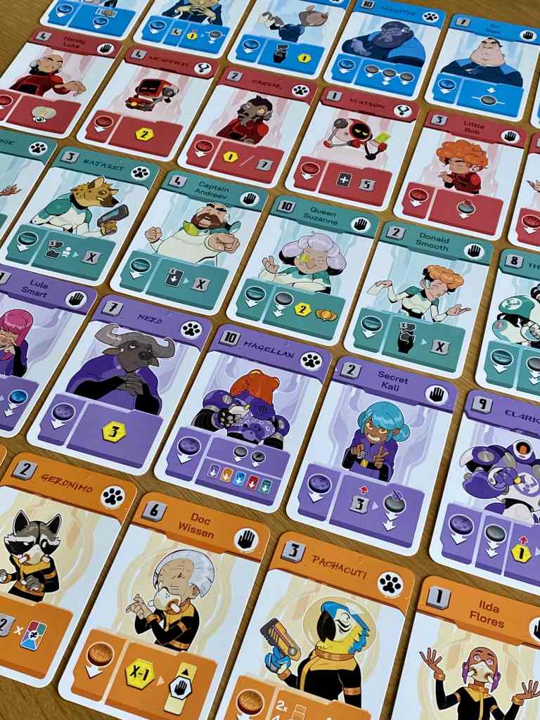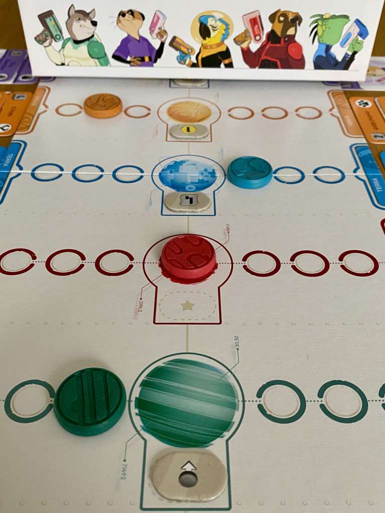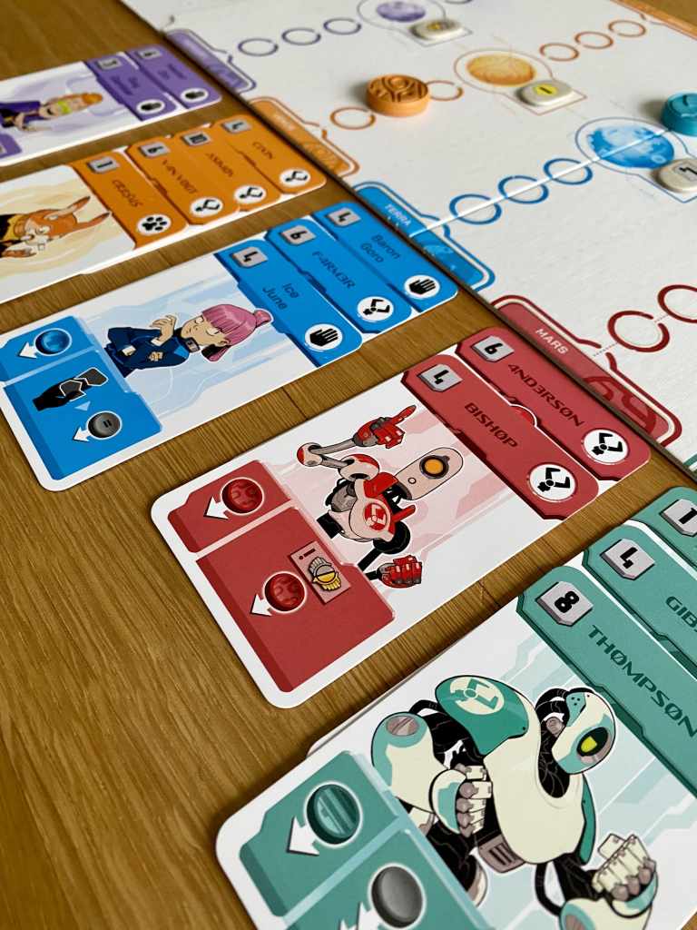 Je ne vais pas m’attarder sur sa thématique futuriste qui s’efface presque instantanément dès la première carte jouée. Si elle donne lieu à des références amusantes dans le nom des cartes, elle se révèle vraiment anecdotique devant une mécanique forte et une expérience de jeu sensationnelle. Certes, elle apporte les trois types de cartes et la lutte pour le contrôle des planètes, mais les joueurs se tireraient la bourre pour des tigres et des girafes, le résultat serait le même.