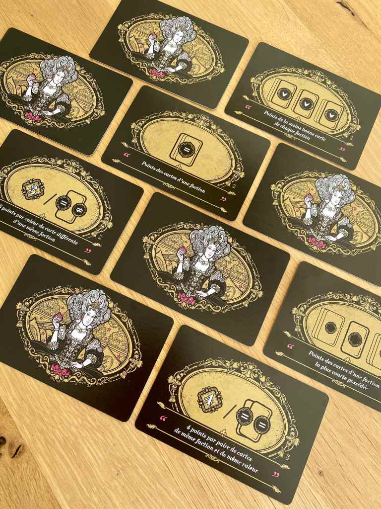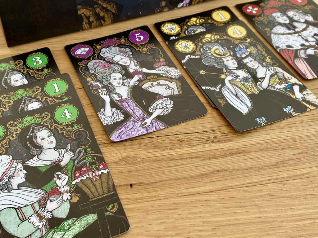 Même si l’on oublie très vite la thématique, il faut avouer qu’elle ne manque pas de panache. Sur le papier, j’adore l’idée ! En réalité, cette lutte d’influence pour gagner les faveurs de la reine Marie-Antoinette à la cours de Louis XIV s’avère être un simple jeu de cartes. Simple, pas tout à fait. En fait, si les règles sont accessibles, le titre se révèle assez tactique et sa prise en main n’est pas si évidente, la faute à un livret de règles confus et assez maladroitement rédigé. Pourtant, dès les premiers tours, les joueurs se rendent compte de la limpidité de l’expérience.