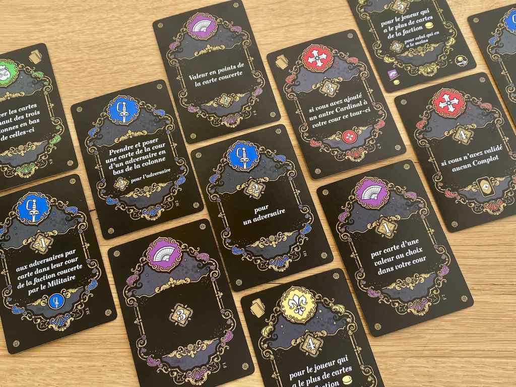 – Valider une carte Complot. Le joueur actif révèle une de ses cartes Complot (il en possède quatre en début de partie) s’il possède dans sa cour les conditions de sa validation. Il remporte les points en conséquence.