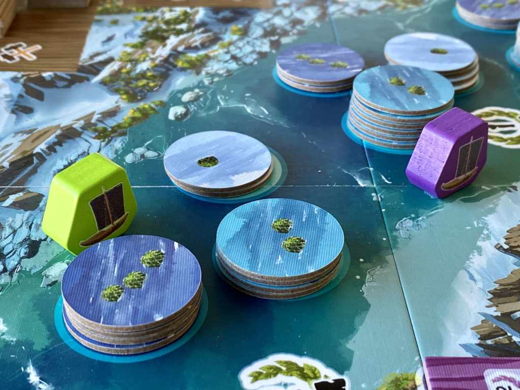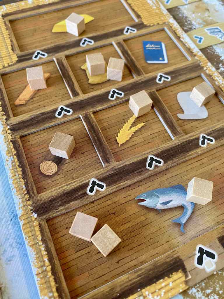 Pourquoi ? Parce que SALTFJORD permet de bidouiller en permanence. Non seulement les joueurs se créent leur propre moteur d’actions par un Tetris de tuiles, mais ils peuvent farfouiller dans leurs ressources pour notamment les vendre contre du poisson. Je parle beaucoup du poisson… Il est essentiel et permet également de changer la valeur des dés sélectionnés ou d’améliorer des ressources en produits plus chers et plus rentables. En résumé, il existe certes, deux actions principales, mais les participants pourront faire tout un tas de petites choses annexes permettant de se dépatouiller de leurs grands problèmes de gestion. Oui, SALTFJORD est un jeu de « draft » de dés, de pose de tuiles, mais il est surtout un jeu de gestion de ressources exigeant et réclamant beaucoup d’adaptation.