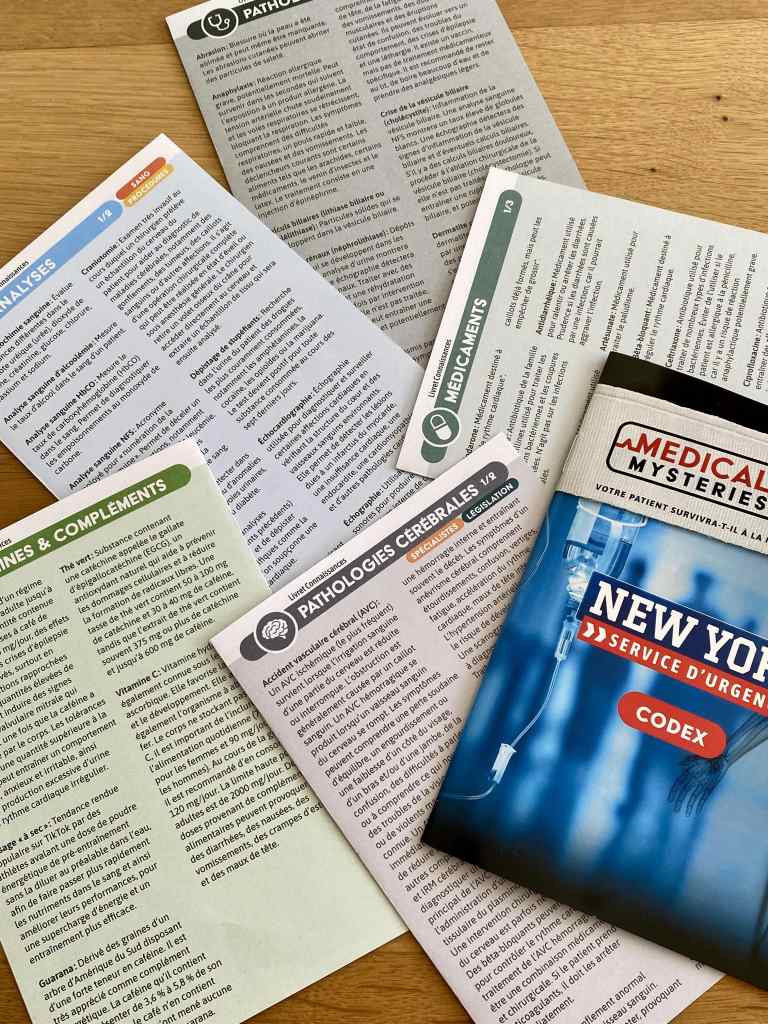 Difficile de ne rien spoiler pour parler de NEW YORK, SERVICE D’URGENCES… Les joueurs incarnent un médecin ou une équipe médicale (comme vous voulez), regroupant les informations d’un patient fraîchement arrivé aux urgences pour le soigner et pour qu’il survive à la nuit. Des documents sont à analyser et des actions sont à réaliser en conséquence, ce qui amène d’autres actions. Toutes les trois options entreprises, un bilan de santé est effectué amenant encore d’autres décisions à prendre jusqu’à la stabilisation totale du patient ou son décès.
