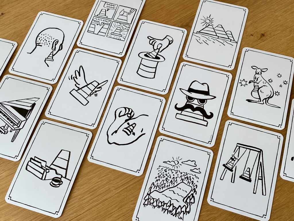 Ici, les choses se compliquent légèrement. Les illustrations, toujours noires et blanches et de même style, représentent des situations plutôt que des objets. Plutôt que d’offrir des cadeaux, les joueurs se présentent donc à leurs adversaires en se mettant dans la peau d’un personnage correspondant à la situation de la carte. Par exemple, Tony Estanguet peut tout à fait représenter le dessin des Jeux Olympiques. Une seule chose compte, et il s’agit de la situation ou du critère comme décrit dans la règle. Ainsi le joueur suivant peut tout à fait prendre une autre personnalité, comme Félix Lebrun, pour se présenter à l’un de ses camarades. Ainsi, même si la mécanique reste inchangée, l’expérience se veut moins rigide alors même que les joueurs doivent se souvenir de deux éléments, le critère de façon obligatoire et le personnage de façon optionnelle.