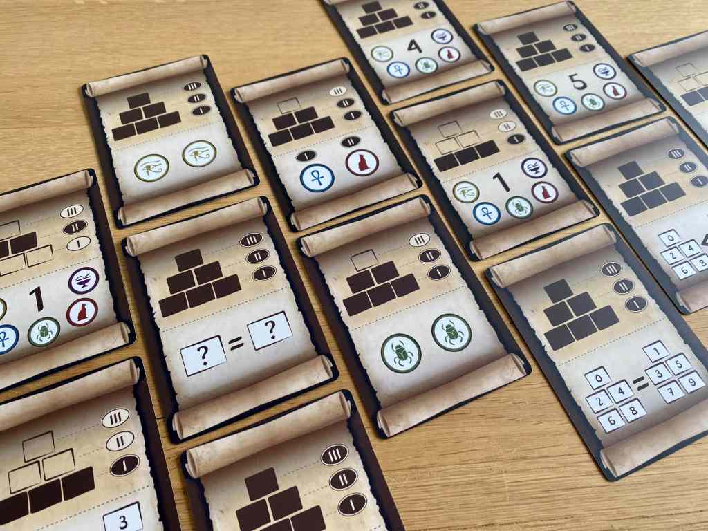 Oui, c’est dommage, car derrière ce petit format qui ne paie pas de mine, se cache un casse-tête redoutable. N’ayons pas peur des mots. Il y a tromperie sur la marchandise, mais pour une fois, plutôt dans le bon sens. En effet, je m’attendais à tout sauf à ce « brûle-neurones » ! Pourtant, les règles sont assez accessibles. Les joueurs possèdent trois points d’action à chaque tour, pour prendre des pierres, construire une pyramide de trois étages avec celles-ci ou pour se défausser de cartes. Jusque-là, on se dit que cela va être un jeu d’enfant. Mais les règles de poses sont contraignantes en plus des objectifs de partie à réaliser. La contrainte la plus sournoise, mais la plus intéressante aussi, réside dans l’interdiction de jouer avec certaines valeurs ou couleurs déterminées par les défausses de cartes adverses. Il y a donc moyen de bien d’enquiquiner dans DJESER, et j’aime particulièrement cela.