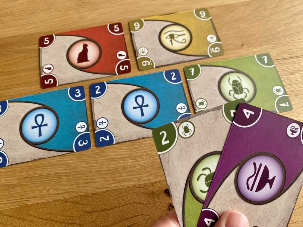 Le tour d’un joueur s’arrête lorsqu’il ne veut plus ou ne peut plus utiliser de points d’actions. Le Nil est de nouveau rempli en faisant circuler les cartes vers la gauche. Si le joueur actif n’a pas collecté de pierre lors de son tour, la carte la plus à gauche du Nil est défaussée dans l’une des Défausses maudites.