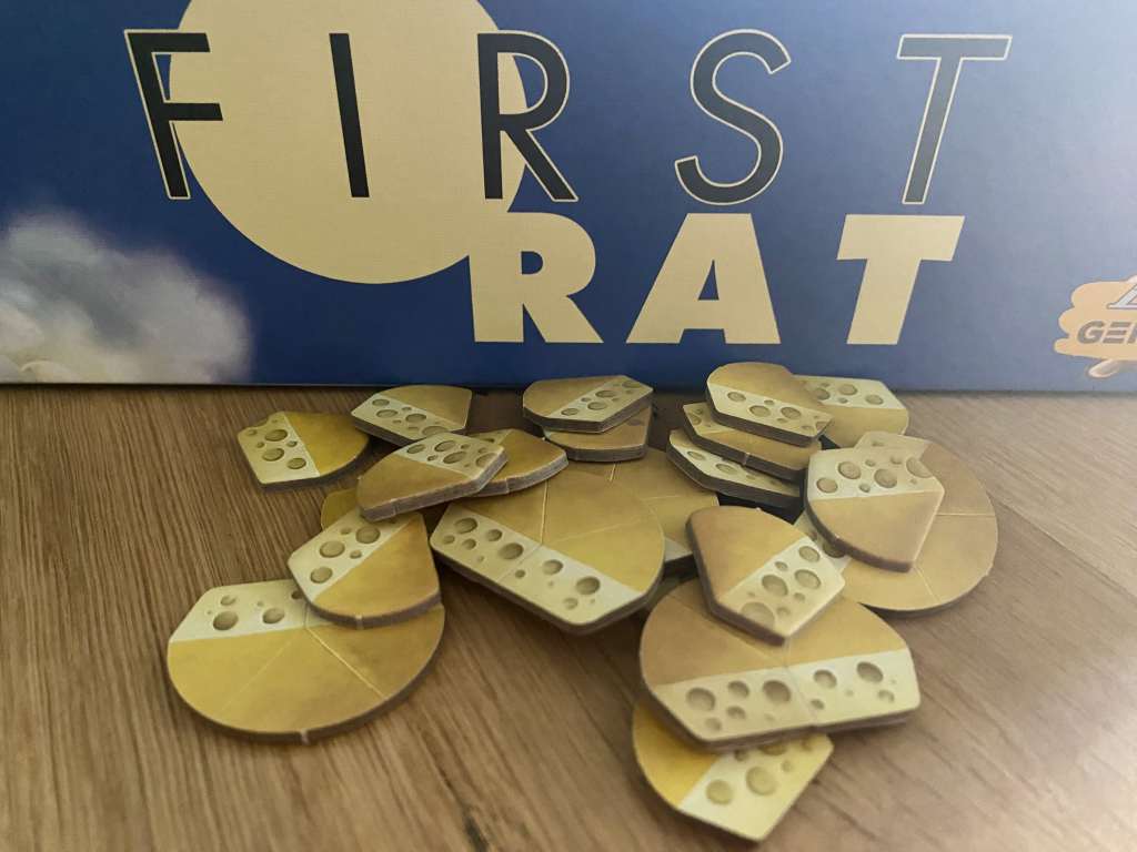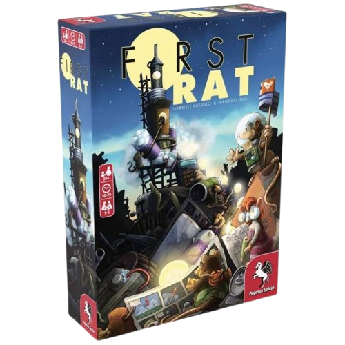 FIRST RAT, c’est avant toute chose un thème amusant, farfelu et plutôt bien concrétisé. Les joueurs incarnent des familles de rats tentant de construire une fusée, avec les déchets qui les entourent, afin de s’envoler vers la Lune, vue comme un gigantesque morceau de fromage. Si cette thématique ne vous vend pas du rêve, je n’y comprends plus rien ! Avec une histoire pareille, le jeu prend des allures très enfantines et familiales, alors qu’en réalité, il se positionne davantage dans la catégorie des titres initiés.