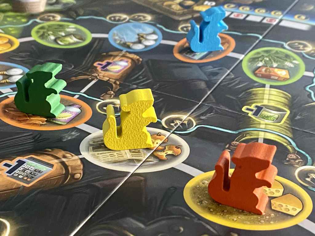 En effet, à leur tour, les participants déplacent un rat de une à cinq cases ou plusieurs rats de une à trois cases, mais finissant leur mouvement sur une tuile de même couleur. Le but de tout ça ? Amasser des déchets, du fromage, des trognons de pomme et des ampoules. Pour ? Pour livrer les déchets afin de construire la fusée, progresser sur deux pistes, l’une afin de se développer, l’autre afin de récupérer encore davantage de ressources. C’est simple, oui, mais c’est plus casse-tête qu’il n’y paraît pour un basique « pickup & deliver ».