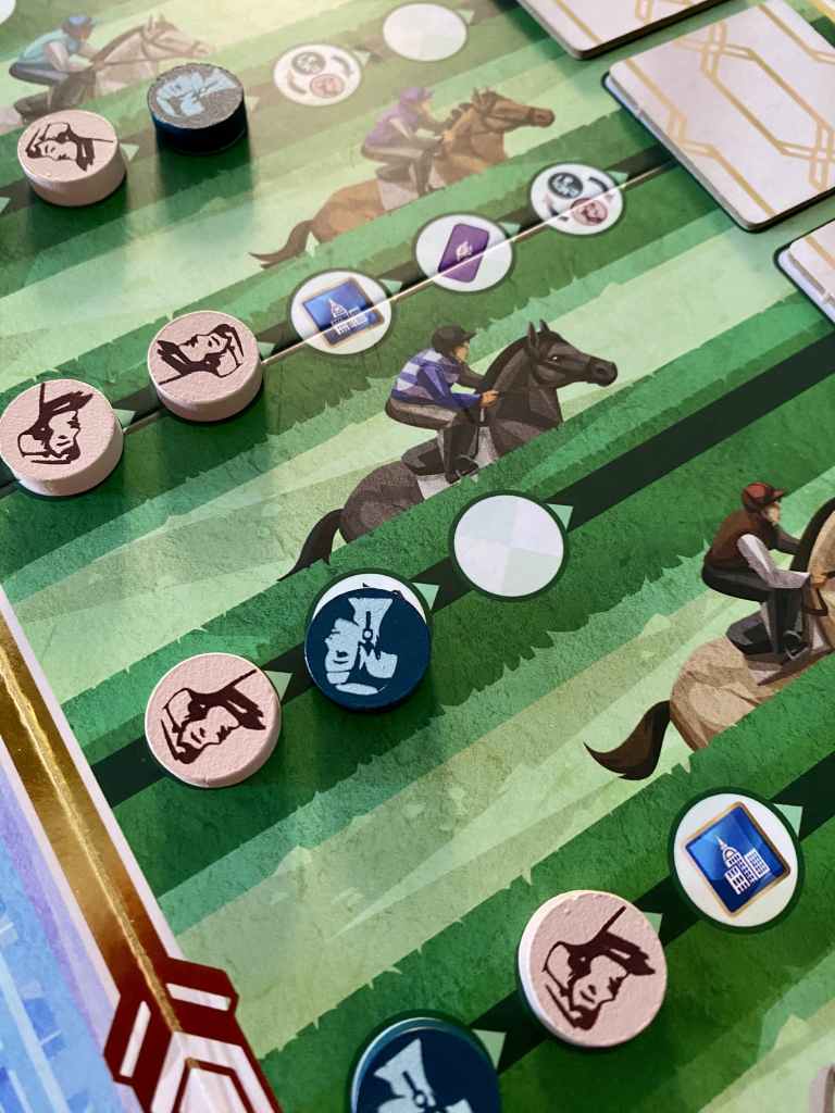 ° L’Hippodrome. Il s’agit de placer un jeton sur l’emplacement vide le plus à gauche d’une piste. Lorsqu’une piste est complète, le joueur ayant le plus grand nombre de jetons sur celle-ci remporte le personnage correspondant.