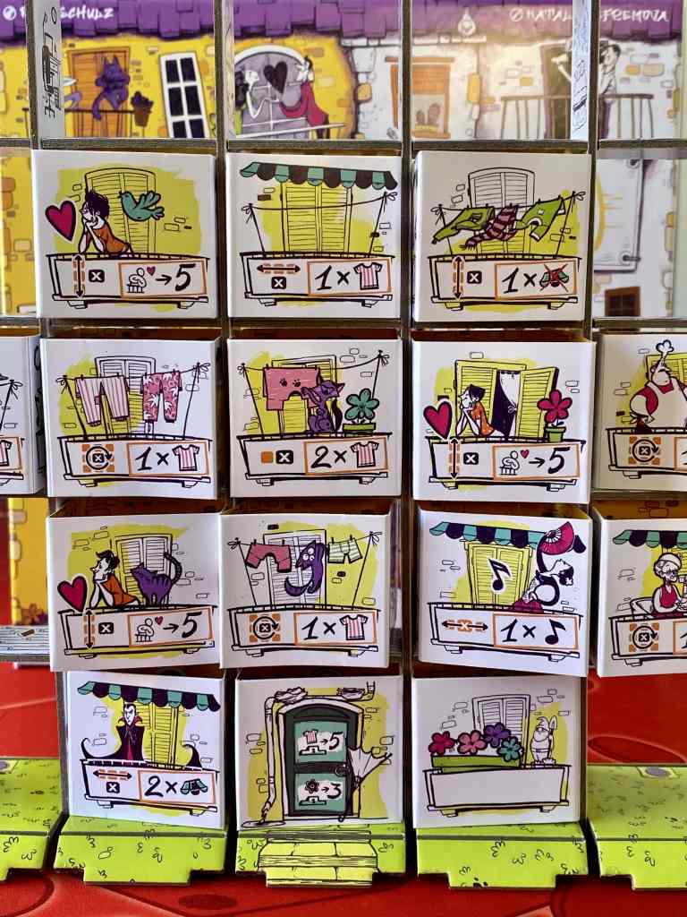 Les règles sont simples. BALCONIA propose une sorte de « I split, you choose » dans lequel le premier joueur choisit deux faces d’un cube et l’adversaire entérine une face et son placement dans l’immeuble. L’idée mécanique est encore une fois sympathique, mais va s’avérer dans les faits bien trop chaotique.