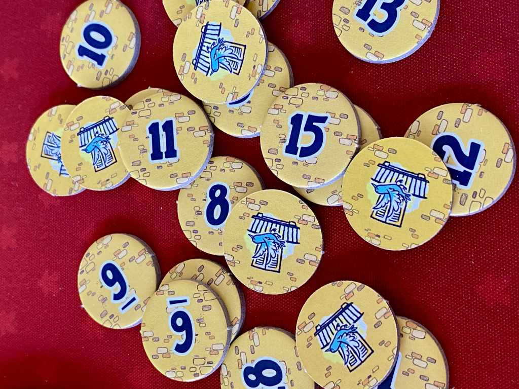 – Le joueur Turquoise (faisant face à la porte turquoise) révèle l’un des 14 jetons face cachée et s’empare du bloc Balcon correspondant au numéro pioché.