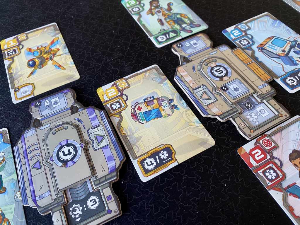Successivement, les joueurs entreprennent une des trois actions possibles. Ils peuvent piocher trois cartes Lab et conserver toutes celles appartenant à la même agence, prendre toutes les cartes d’une même agence du Centre de Recrutement (visible au centre de la table) ou poser des cartes de leur main dans leur Station. Chaque carte indique un nombre de cartes à défausser pour pouvoir être posée, son agence d’affiliation, une spécialité et un effet immédiat ou une condition de « scoring » final. La Station de chaque participant se constitue de trois Capsules, autour desquelles les cartes sont positionnées (aux quatre côtés). Ainsi, les trois emplacements du haut permettent la récupération de cartes Projet, alors que ceux du bas octroient d’un avantage à condition de respecter la spécialité réclamée par chaque Capsule. Aussi, en début de partie, trois objectifs sont positionnés sur les Capsules et demandent à ces dernières d’être entourées de cartes d’Agences spécifiques. Dès qu’un joueur rassemble les conditions réclamées, il récupère la première tuile Validation de l’objectif associé.