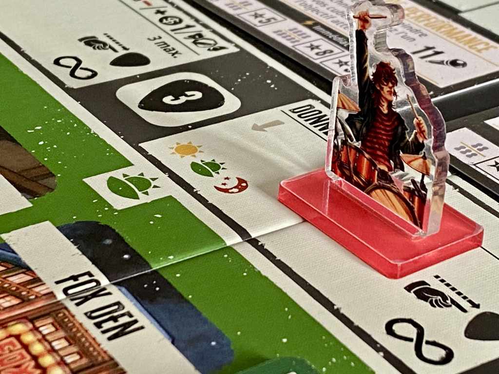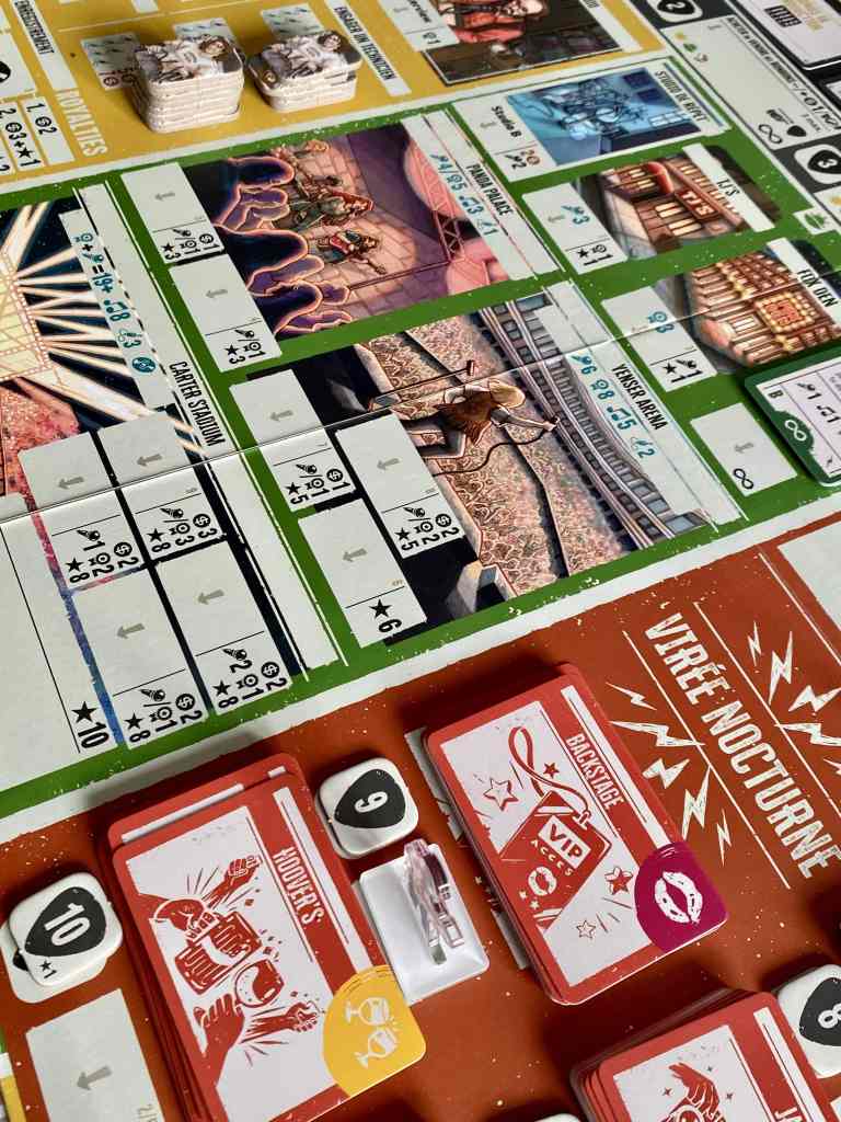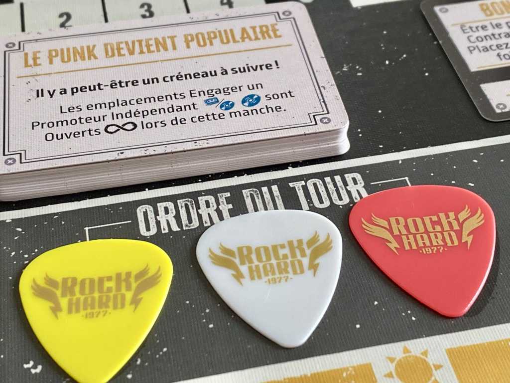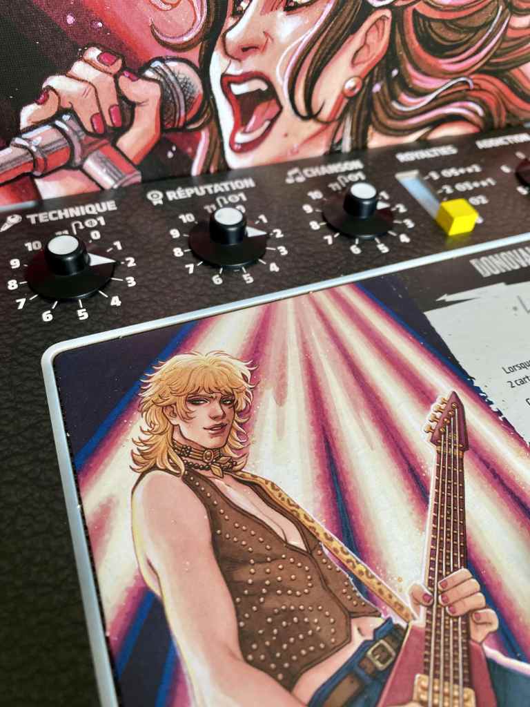 Le thème se révèle, effectivement, extrêmement enchanteur ! Vous tentez de vous faire une place sur la scène Rock américaine ! Et l’immersion passe par une profusion de matériel, rappelant le milieu musical. Rien n’est laissé au hasard, du plateau de gestion rappelant les amplis, aux médiators pour définir l’ordre du tour en passant par les « bonbons » vous donnant de l’énergie supplémentaire. Tout est fait pour que les participants se prennent au jeu le plus possible. Parlons aussi de cette magnifique illustration de couverture ! Attention, avec une identité visuelle pareille, le jeu a intérêt à envoyer du lourd.