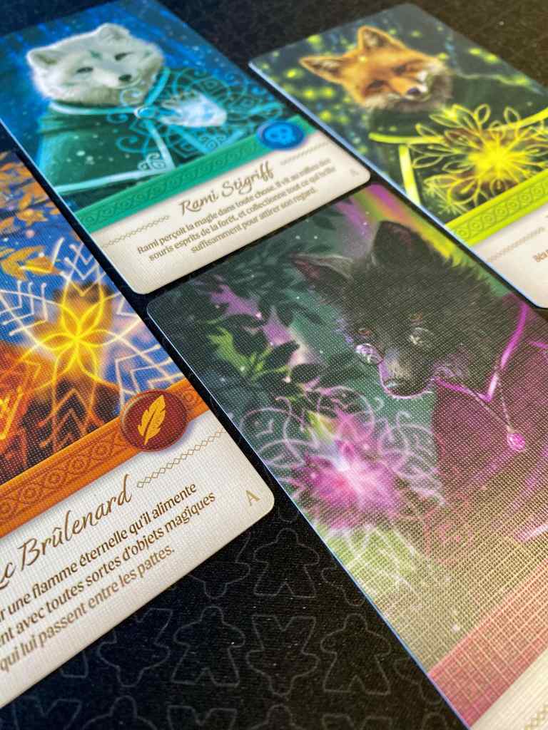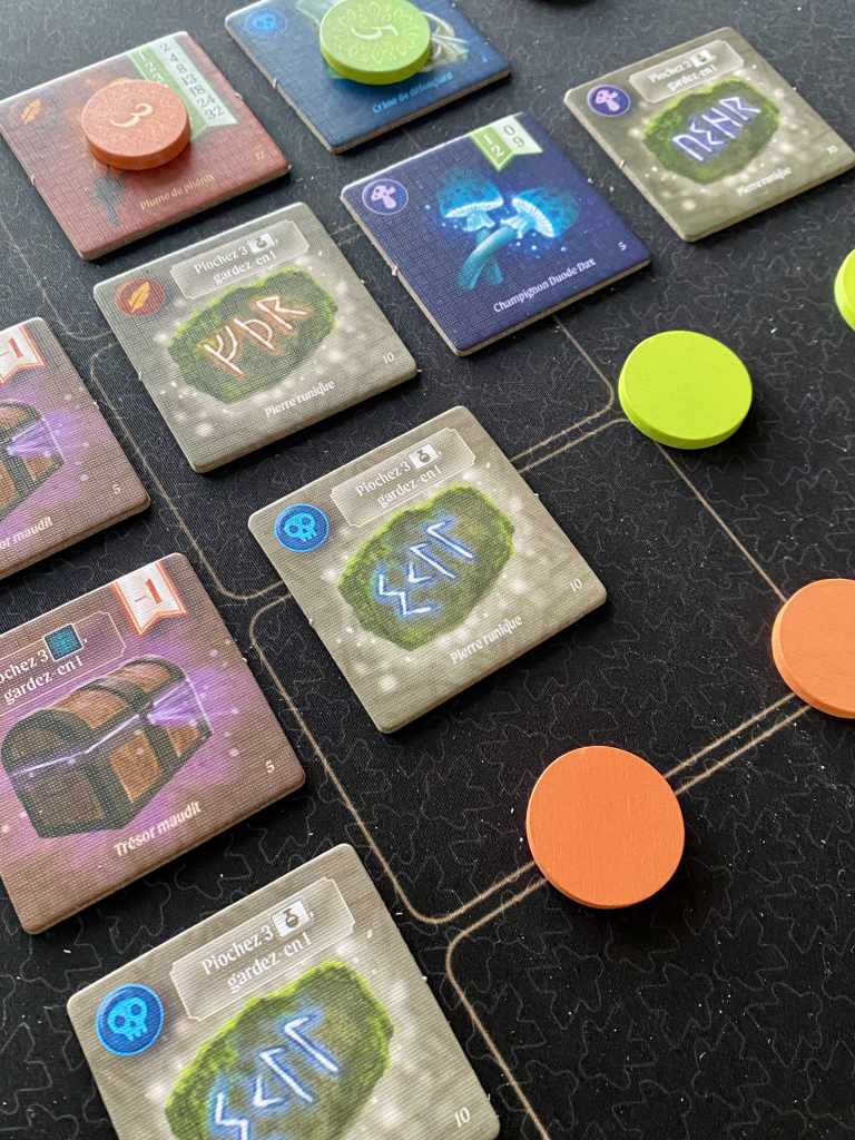 Et visuellement, je n’accroche pas du tout. Attention, c’est très personnel. Les illustrations sombres me donnent, limite, la chair de poule. Pourtant, le jeu n’évoque qu’une promenade en forêt. J’ai du mal à saisir le choix des illustrations aussi austères pour un loisir normalement sympathique. Le côté fantastique passent complètement à l’as.