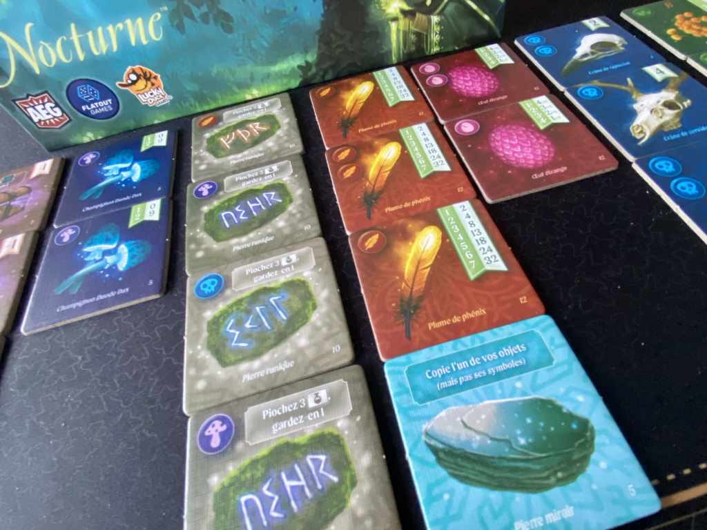 NOCTURNE est le dernier jeu de la gamme comptant CASCADIA, VERDANT ou encore CALICO. Seul le premier cité m’avait véritablement emballée. J’avais trouvé les autres un peu trop alambiqués pour l’expérience proposée. Laissons une chance à cet opus et à sa thématique mystique.