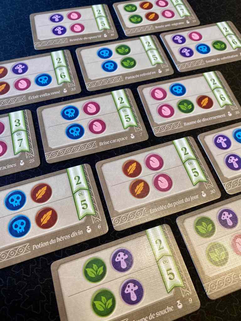 C’est particulièrement dommage, car l’objectif de collection d’objets est bien senti, avec pour chaque type un « scoring » différent. L’association entre enchères et collection se révèle vraiment efficace. Mais d’autres paramètres alourdissent le titre un peu inutilement. Il y a déjà ces objectifs de manche, qui pour certains se tournent vers le placement abstrait de nos pions. Il y a aussi ces symboles sur toutes les tuiles qui concourent à la réalisation de potions, autrement dit à la réalisation d’autres objectifs, cette fois personnels. Il y a encore ce plateau secondaire permettant de récupérer des tuiles, en mode seconde chance, en fin de manche. Bref, c’est un peu beaucoup pour un jeu à la cible familiale. Il aurait pu être un brin plus épuré et l’expérience et le décompte final auraient été sans doute plus fluide.
